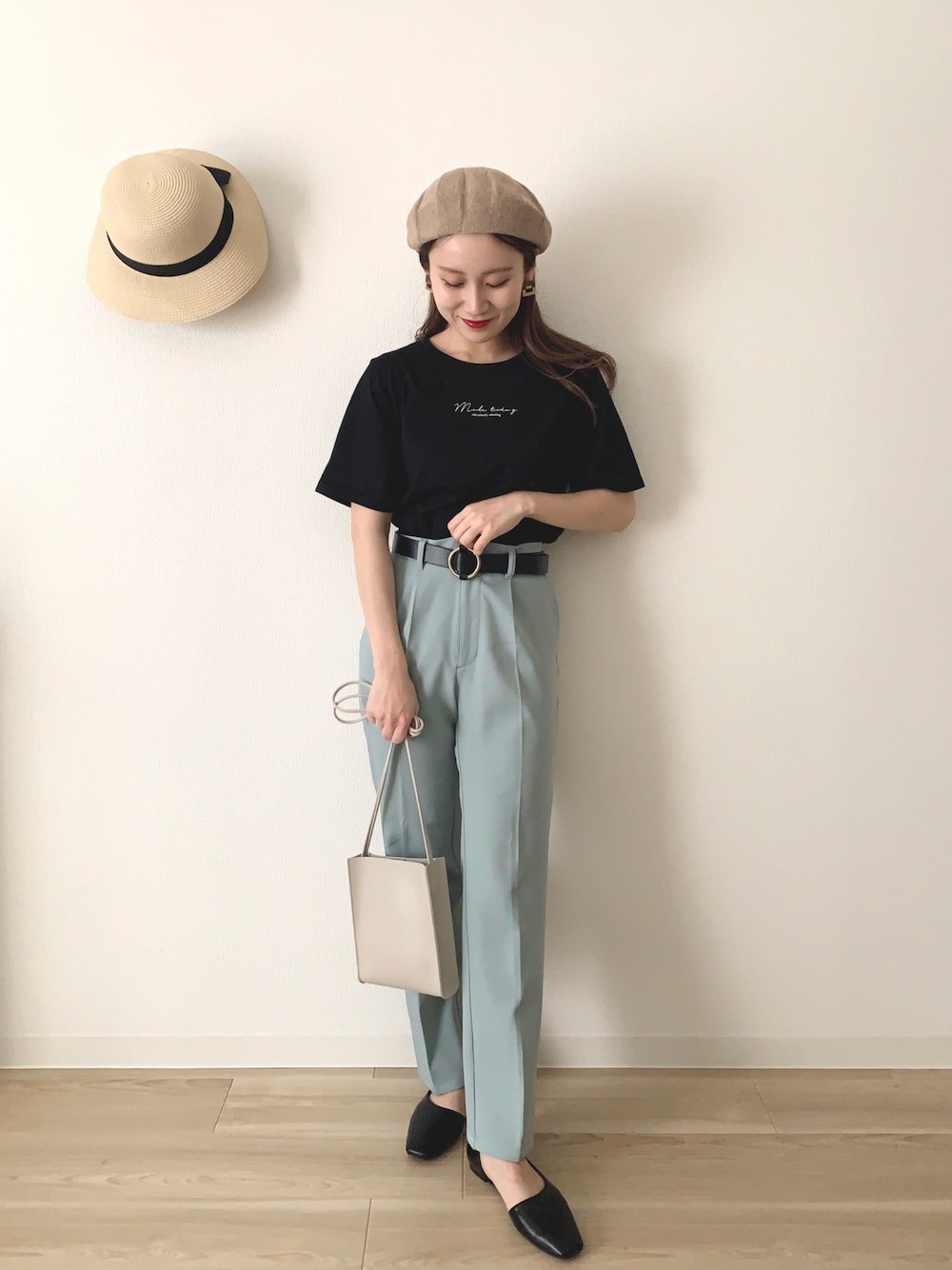 カラーパンツとTシャツで夏っぽコーデ♪ 小物を黒やベージュで合わせたので グリーンのパンツが引き立ちます♡ Instagram ▶︎ mw._.mio