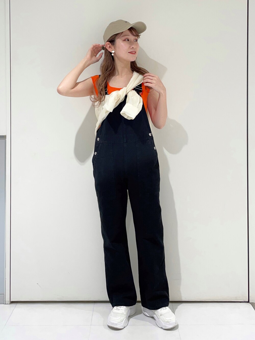 スニーカー合わせのカジュアルコーデ♪ ちらっと見えるオレンジのトップスがポイント❤︎