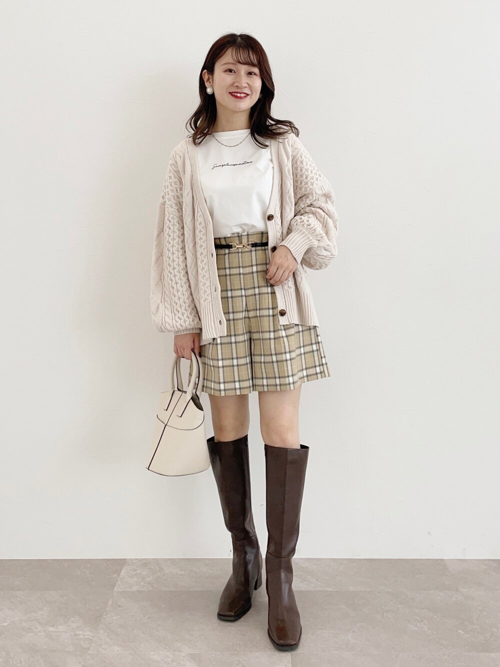 ケーブルカーディガンオフホワイトを着回し! サイズはMサイズです ゆるっとしたカーディガンに スッキリ見えするショートパンツを合わせました♪ ※サンプルのためブーツはLサイズを着用していますが、 普段は23.5cmでMサイズを履いています Instagram▶︎mw._.mio