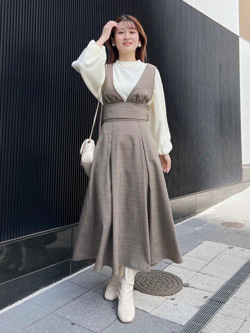 チェックのジャンスカコーデ☺︎ 【ジャンスカ】 実はビスチェとスカートが別でも使えるセットアイテム❤︎ スカートはふわっと広がるフレアシルエット♪ サイズはS.M展開で、155cmMサイズ着用足首くらいの丈感です 【ニット】 厚すぎない生地で、ジャンスカやスカートにインする際でもすっきり合わせられるニット☺︎ プチプラなのでとってもオススメです♪ 【ブーツ】 ストレッチ性が効いていて靴づれしにくいオススメブーツ! ヒールも高すぎず疲れにくいです。 ※サンプルのためブーツはLサイズを着用していますが、普段は23.5cmでMサイズを履いています Instagram▶︎mw._.mio
