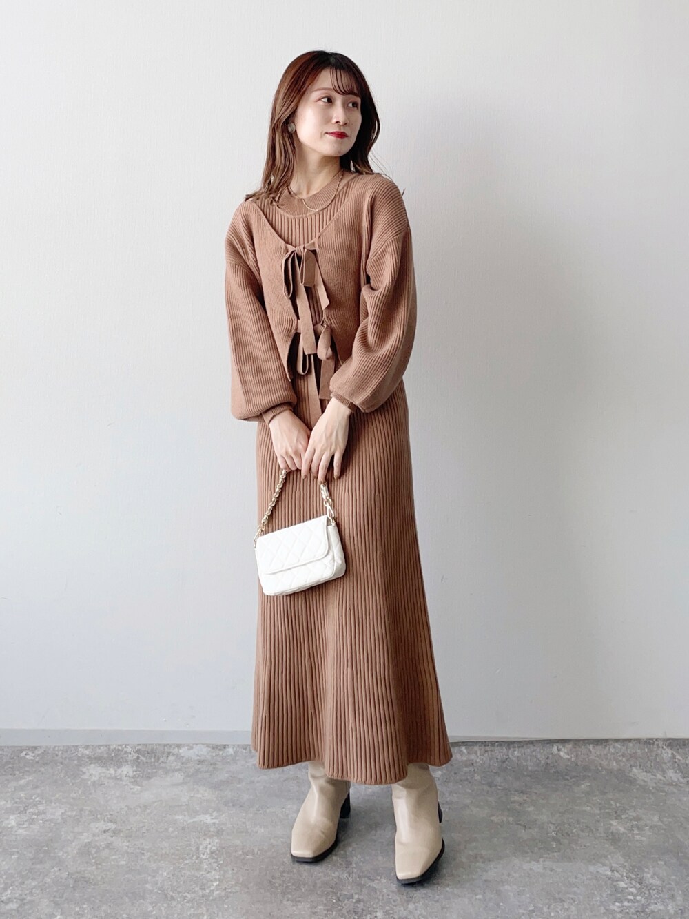155cm|骨格ウェーブ 【ワンピース】 ショートニットとノースリワンピのセットアイテム♪ ショートニットは前後2wayでどっちバージョンも着てみました☺︎ 【ブーツ】 ワンピースの下、実はロングブーツ履いてます♪ スクエアトゥで先が綺麗に見えるので綺麗めコーデに合わせたいブーツ☺︎ ※サンプルのためブーツはLサイズを着用していますが、普段は23.5cmでMサイズを履いています Instagram▶︎mw._.mio