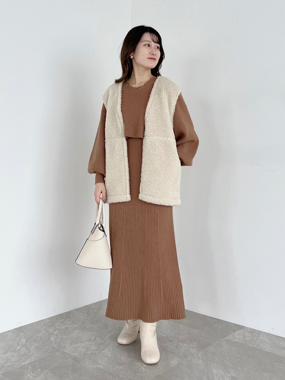 155cm|骨格ウェーブ 【ベスト】 ボアとムートンのリバーシブルベスト❤︎ お尻かかるくらいの丈感で安心感あります☺︎ アウターの中にさらっと仕込むのも暖かいです! 【ワンピース】 ショートニットとノースリワンピのセットアイテム リボンを後ろで着てますが、ベストを脱いだ時までお洒落に着られます♪ 【ブーツ】 ストレッチ性が効いていて靴ずれしにくいオススメブーツ! ヒールも高すぎず疲れにくいです。 Instagram▶︎mw._.mio