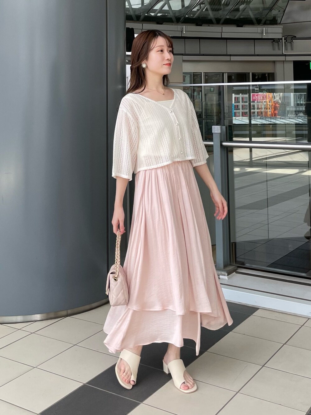 155cm|骨格ウェーブ 【トップス】 タンクトップとセットのショートカーディガン♪ レースデザイン、パールボタンがフェミニンな印象に見せてくれます☺︎ ハイウエストのスカートと合わせるのがミスティらしくておすすめです♪ 【スカート】 misaさんコラボのスカートです❤︎ アシンメトリースカートは生地が柔らかく、動くたび揺れ感が上品です。 本当に360度違う見え方をするお洒落スカート! サイズはSサイズを着用しています♪ 【シューズ】 カジュアル見えするトングサンダルですが、ヒールがあることでフェミニンな印象に!高すぎないヒールなので履きやすいです♪ ※サンプルのためシューズはLサイズを着用していますが、普段は23.5cmでMサイズを履いています Instagram▶︎mw._.mio
