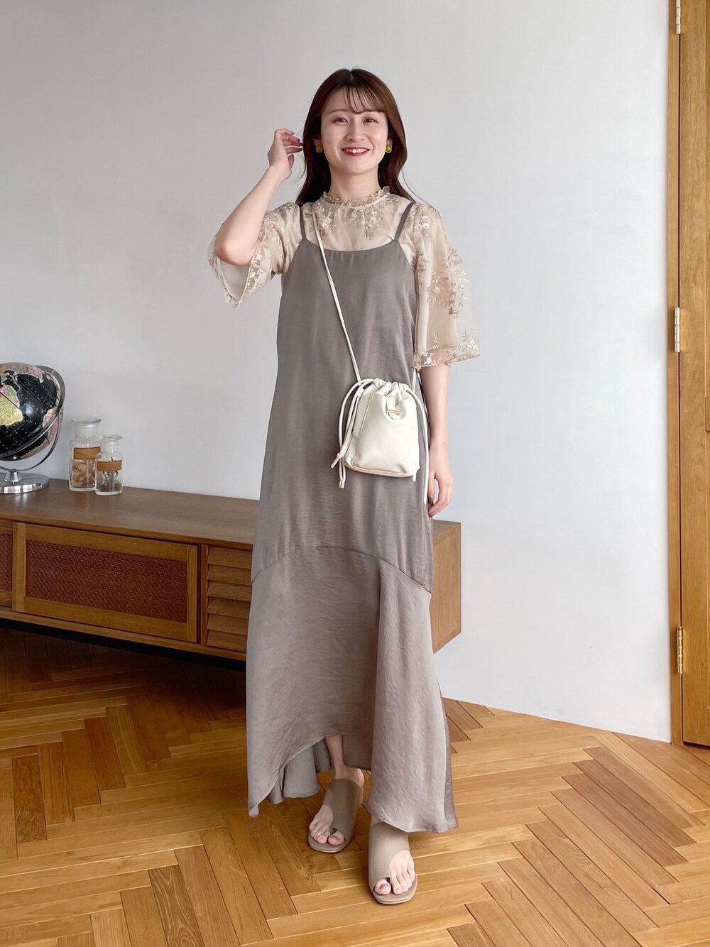 155cm|骨格ウェーブ 【ブラウス】 大好きなフローラル刺繍ブラウス♪ 上品な刺繍デザインが毎回素敵…❤︎ これで洗濯もできちゃうなんて神すぎる! 透け感あるのでインナーは必須です☺︎ 【ワンピース】 上品な揺れ感が大人っぽいキャミワンピ❤︎ 前後差があり、後ろが少し長めのデザインです。 アジャスター付きなので長さの調整も可能! 【シューズ】 カジュアル見えするトングサンダルですが、ヒールがあることでフェミニンな印象に!高すぎないヒールなので履きやすいです♪ ※サンプルのためシューズはLサイズを着用していますが、普段は23.5cmでMサイズを履いています Instagram▶︎mw._.mio