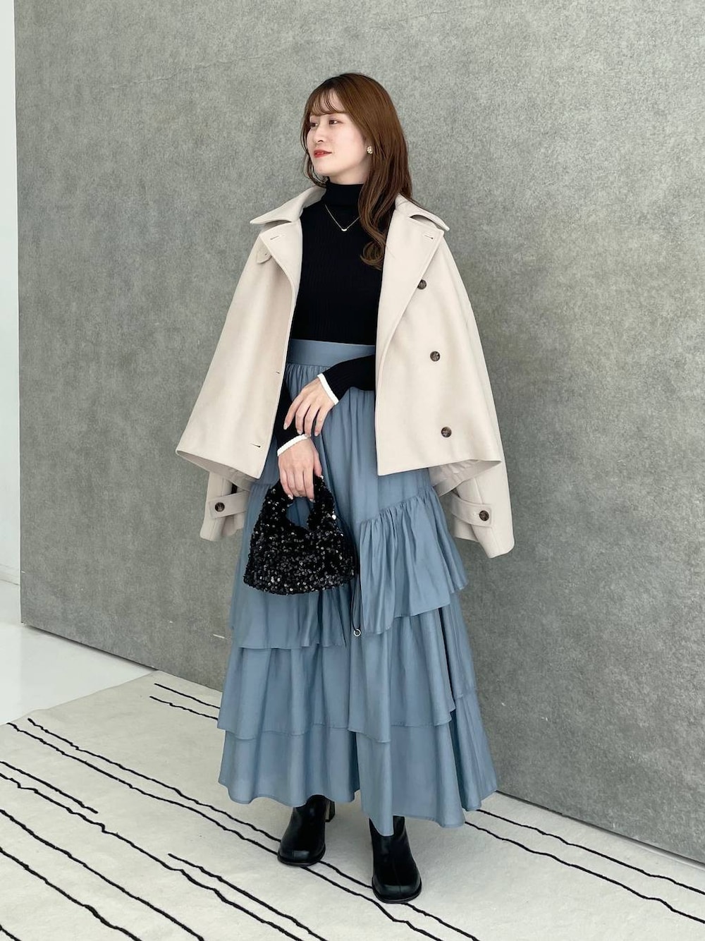 155cm|骨格ウェーブ 【コート】 去年大大大人気だったショートコート! スタンドカラー、ビッグカラー、ステンカラー3wayで楽しめます☺︎ 袖口はゆとりがあるので厚手のニットもばっちり着込めます。 【ニット】 ベーシックな万能タートルネックニットです。 首元は2つ折りも3つ折りもできますが、3つ折りがスッキリしてお気に入りです☺︎ 程よくフィット感があり、ジャケットの中にも着ていただきやすいです。 【スカート】 ランダムなティアードがお洒落なスカート! 腰周りすっきりめでも骨盤は目立たず、裾に向かってふわっと広がるティアードデザインが存在感あります☺︎ ウエストがゴムで履き心地抜群です。 【ブーツ】 シンプルですが、丸みのあるつま先と変形ヒールがひと癖あるブーツ。丸みのあるつま先は余裕があり、窮屈感なく履けます♪ ※サンプルのためシューズはLサイズを着用していますが、普段は23.5cmでMサイズを履いています