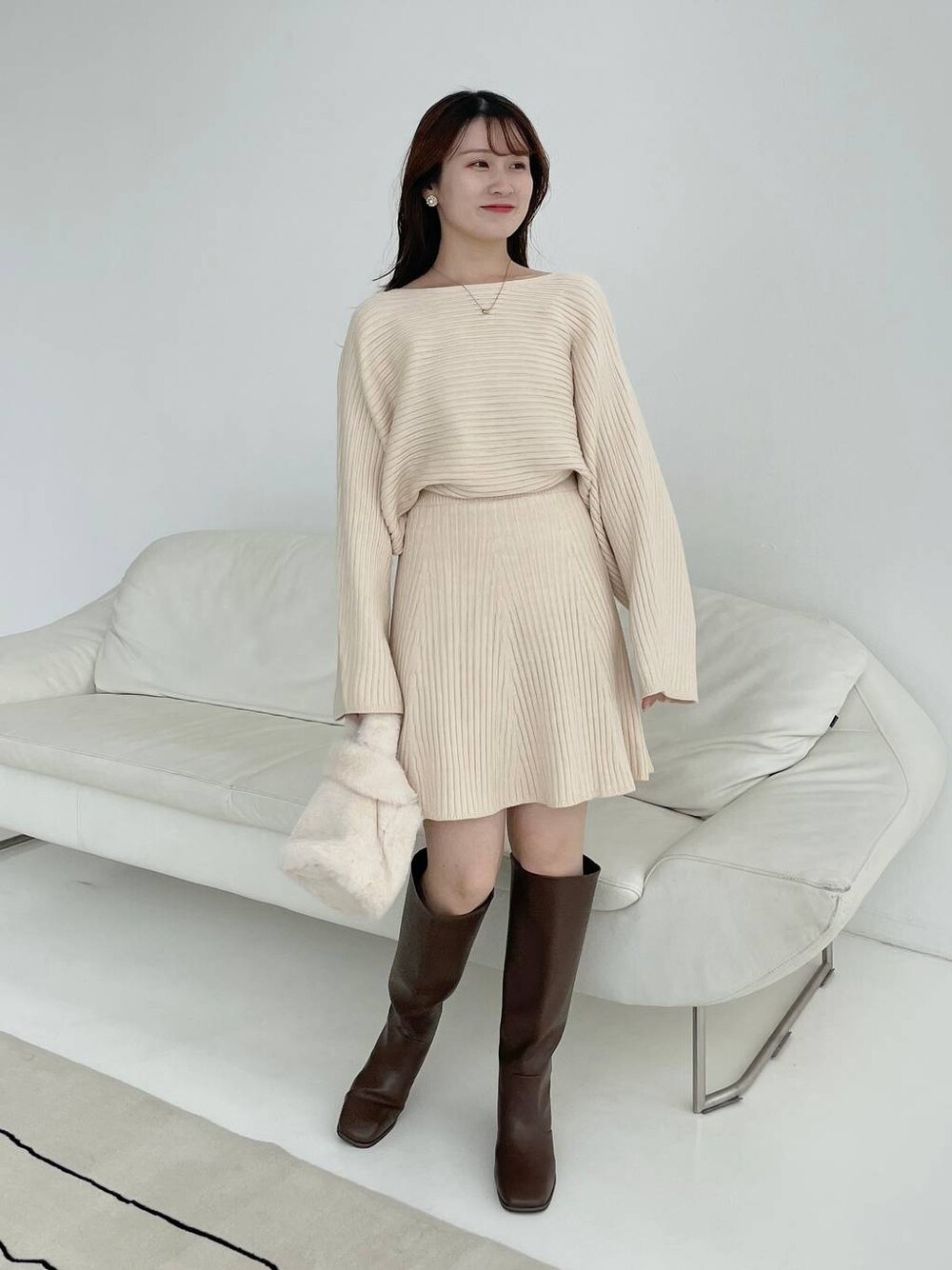155cm|骨格ウェーブ 【ワンピース】 ボートネック&ドルマンスリーブが女性らしいデザイン! ウエストのリブでスカートの丈を少し調整できます☺︎ モテ確定のニットワンピース…♡ 【ブーツ】 チャックがなくそのまますぽっと履けるロングブーツ! ヒールは高すぎず、長時間履いていても疲れにくそうな高さです♪ ※サンプルのためシューズはLサイズを着用していますが、普段は23.5cmでMサイズを履いています