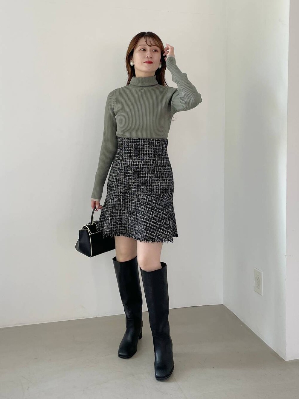 155cm|骨格ウェーブ 【ニット】 ベーシックな万能タートルネックニットです。 首元は2つ折りも3つ折りもできますが、3つ折りがスッキリしてお気に入りです☺︎ 程よくフィット感があり、ジャケットの中にも着ていただきやすいです。 【スカート】 ジャケットとセットアップでも着られるミニスカートです。 マーメイドシルエットなので太ももが細く見えます♪ 裏地はパンツタイプなので安心して履いていただけます。 【ブーツ】 チャックがなくそのまますぽっと履けるロングブーツ! ヒールは高すぎず、長時間履いていても疲れにくそうな高さです♪ ※サンプルのためシューズはLサイズを着用していますが、普段は23.5cmでMサイズを履いています