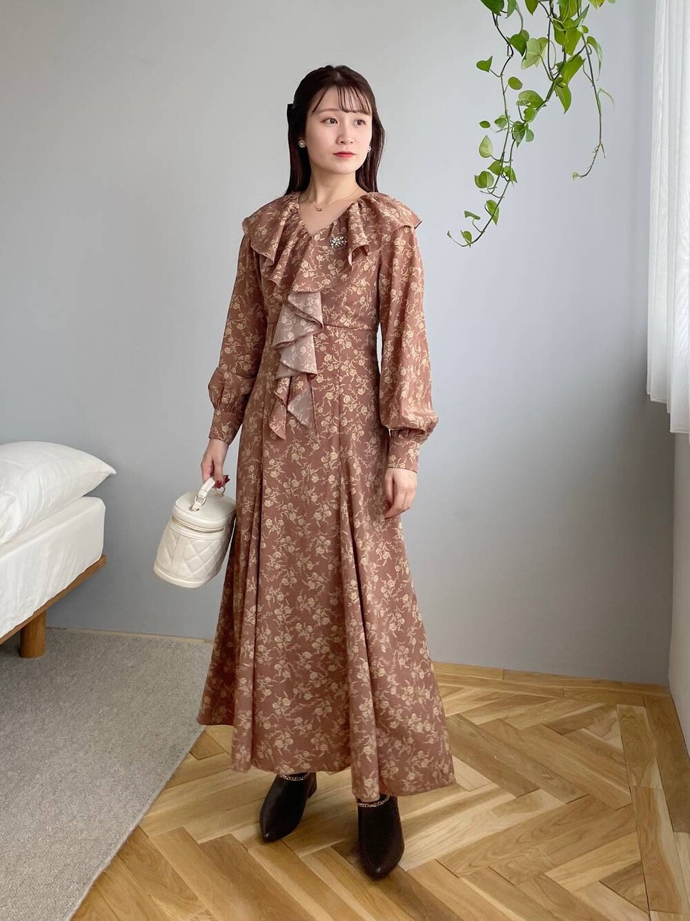 155cm|骨格ウェーブ 【ワンピース】 ビッグフリルがフェミニンな秋っぽワンピ❤︎ ブローチがセットで、付ける位置も気に入るところに付けられます♪ 上からカーディガンを重ねる着方もおすすめです☺︎ 【ブーツ】 取り外し可能のチェーン付きのショートブーツ♪ファスナーがなく、簡単に脱ぎ履きできます! ※サンプルのためシューズはLサイズを着用していますが、普段は23.5cmでMサイズを履いています