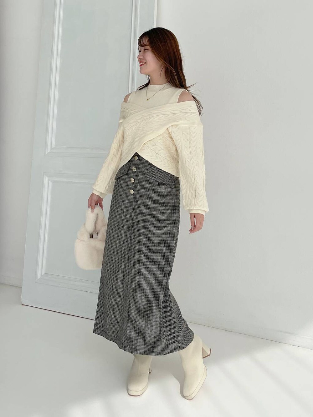 155cm|骨格ウェーブ 【ニット】 ケーブル編みがポイントなニットセットアイテム❤︎ カシュクールトップスのずらし具合で肌見せを調整できます♪ ショート丈なのでハイウエストボトムスとの合わせがおすすめです! 【スカート】 レトロなゴールドボタンのついたスカート♪ 縦のラインが綺麗に見えるタイトスカートです。 生地感は厚すぎず、裏地のない裾の方は若干の透け感があります。 インスタイルもアウトスタイルも楽しめます! 【ブーツ】 厚底デザインなのでヒールの高低差は少なく疲れにくいです。ヒールも太めで安定感があります。 ※サンプルのためシューズはLサイズを着用していますが、普段は23.5cmでMサイズを履いています