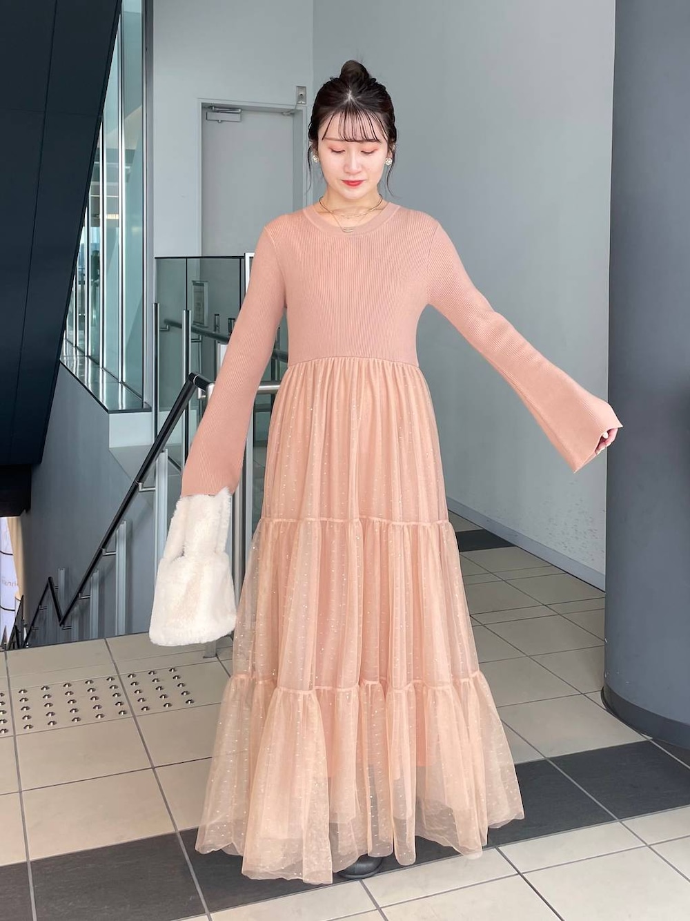155cm|骨格ウェーブ 【ワンピース】 美容系YouTuber「コスメヲタちゃんねるサラ」さんとのコラボアイテム! 「着るクリスマスコフレ」をテーマに、見るだけでもときめき着ても心弾むアイテムです。 ニットとチュールのドッキングデザインで、チュールには程よい大きさのラメ&スパンコール入り♡ フレア袖には手首が細く綺麗に見えるようにスリットが入っています!1枚で映えること間違いなし! ショートからロングアウター、アウター合わせも困らずコーディネートしやすいです♪ 【ブーツ】 シンプルですが、丸みのあるつま先と変形ヒールがひと癖あるブーツ。丸みのあるつま先は余裕があり、窮屈感なく履けます♪ ※サンプルのためシューズはLサイズを着用していますが、普段は23.5cmでMサイズを履いています