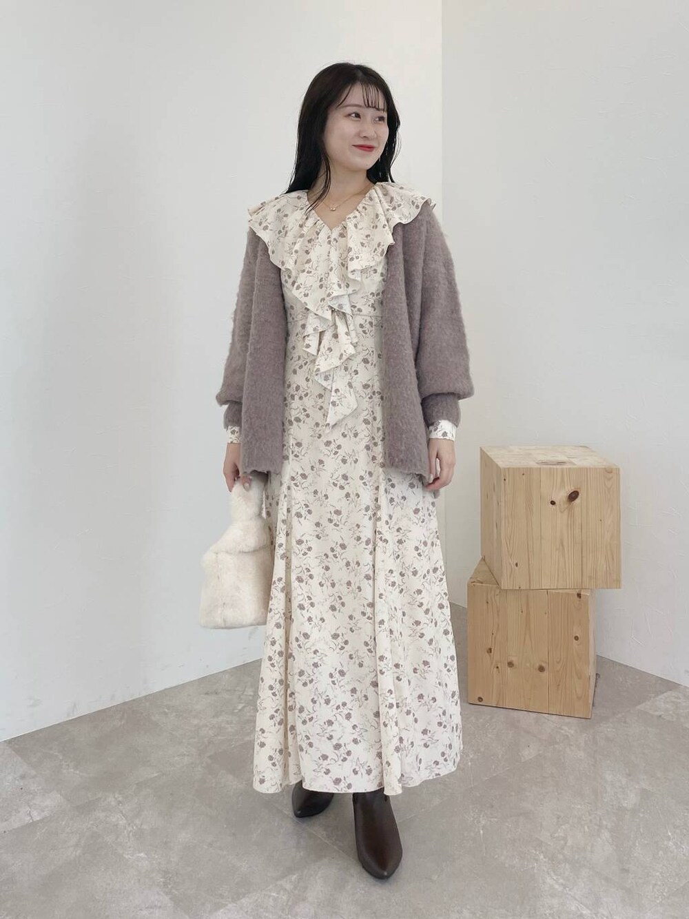 155cm|骨格ウェーブ 【カーディガン】 ヒップかかるくらいの長さでワンピースやロングスカートとも相性抜群!なミドル丈カーディガン♪ Vネックなので、首元にデザインのあるものや、ハイネックなトップスを中に合わせるのもオススメです。 ふわっふわな生地感がずっと触っていたくなる…! 【ワンピース】 ビッグフリルがフェミニンな秋っぽワンピ❤︎ ブローチがセットで、付ける位置も気に入るところに付けられます♪ 上からカーディガンを重ねる着方もおすすめです☺︎ 【ブーツ】 取り外し可能のチェーン付きのショートブーツ♪ファスナーがなく、簡単に脱ぎ履きできます! ※サンプルのためシューズはLサイズを着用していますが、普段は23.5cmでMサイズを履いています
