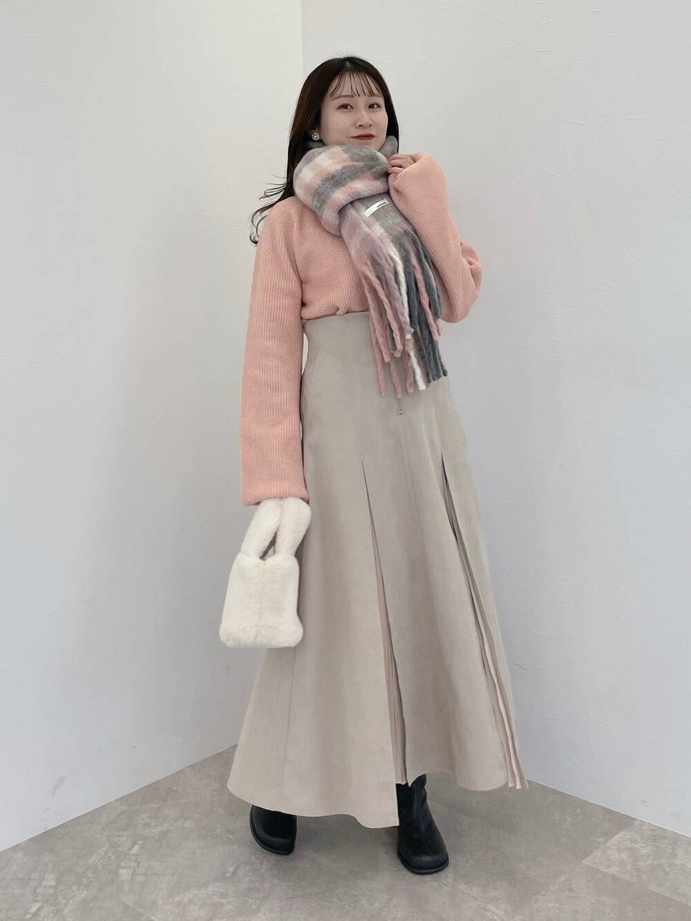 155cm|骨格ウェーブ 【ニット】 ニットのカラーをアイスクリームのフレイバーに例えた名前も可愛すぎるニット!! 柔らかい生地感でチクチクゼロです! 形はシンプルで、首元は開きすぎず詰まりすぎずなクルーネック。 お袖は少し長めでボリュームが出せます❤︎ 【スカート】 さりげないサイドプリーツデザインがポイント! 後ろにも、前と同じようにプリーツが入っています☺︎ トップスはインスタイルでもアウトスタイルでも楽しめます。 【ブーツ】 シンプルですが、丸みのあるつま先と変形ヒールがひと癖あるブーツ。丸みのあるつま先は余裕があり、窮屈感なく履けます♪ ※サンプルのためシューズはLサイズを着用していますが、普段は23.5cmでMサイズを履いています