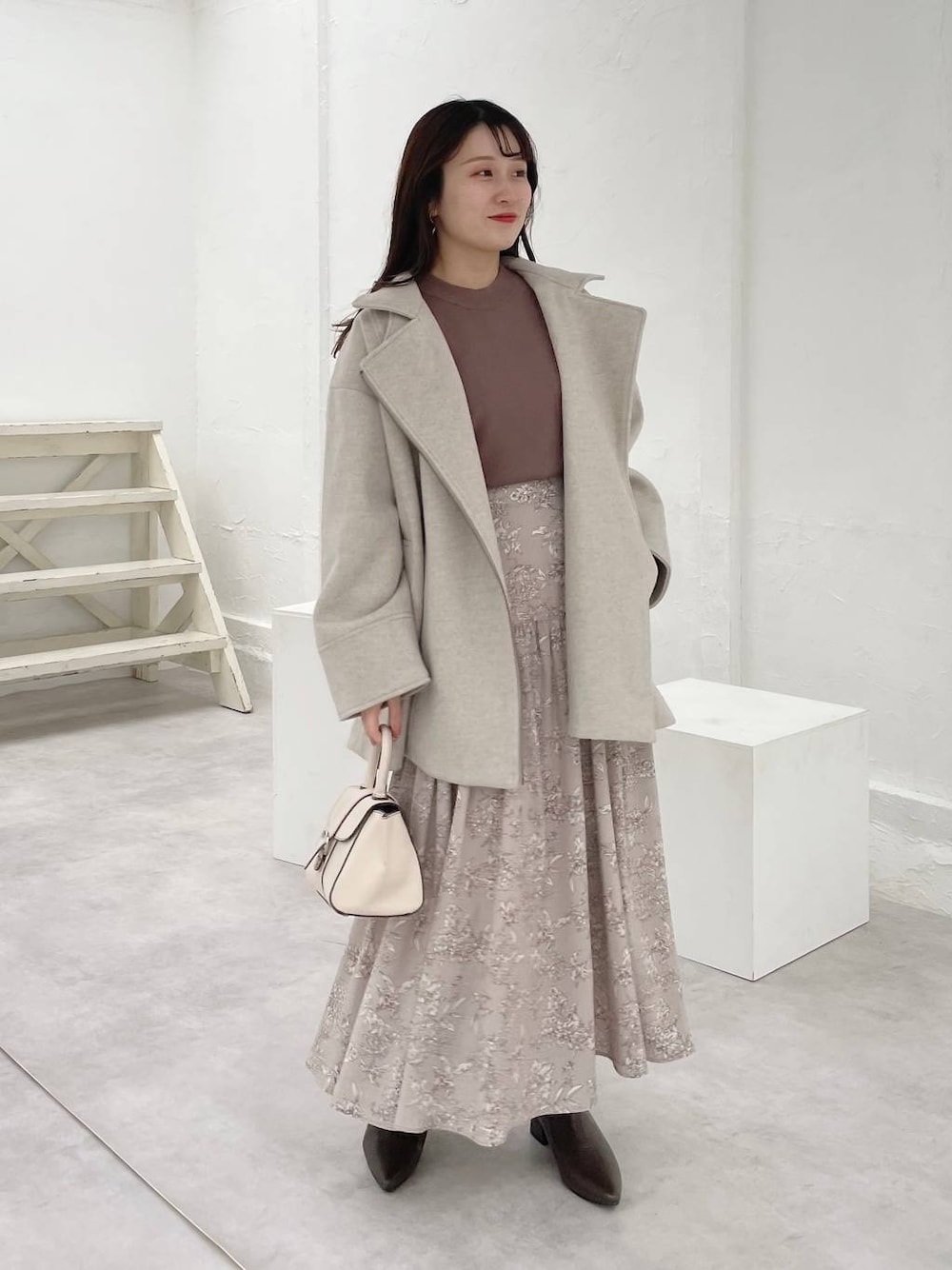 155cm|骨格ウェーブ 【アウター】 ビッグカラーとスタンドカラーが楽しめるアウター! ミドル丈でヒップもすっぽり隠れて暖かいです☺︎ 可愛いニュアンスカラーでの展開♡ 【トップス】 厚手すぎず薄手すぎずなベーシックニット♪ 袖のボリュームが女性らしく、1枚でも、ジャンスカのインナーとしても着用できます☺︎ WEB限定カラーも含めてカラバリ豊富なニットです! 【スカート】 腰周りはすっきりで、切り替えから下は綺麗に広がるスカート♪ シンプルになりがちな冬のニットコーデに、レトロな花柄がマッチします☺︎ 【ブーツ】 取り外し可能のチェーン付きのショートブーツ♪ファスナーがなく、簡単に脱ぎ履きできます! ※サンプルのためシューズはLサイズを着用していますが、普段は23.5cmでMサイズを履いています