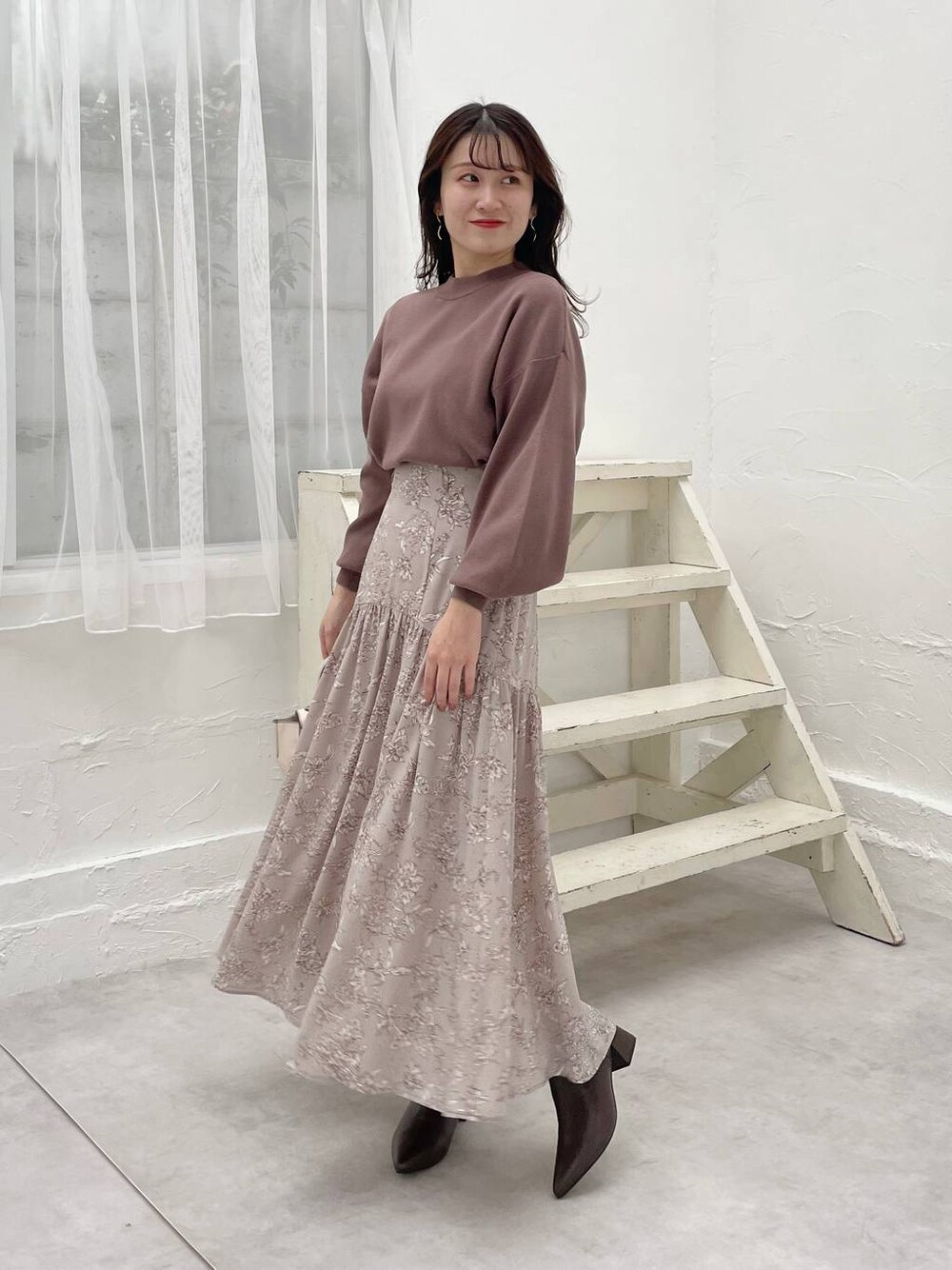 155cm|骨格ウェーブ 【トップス】 厚手すぎず薄手すぎずなベーシックニット♪ 袖のボリュームが女性らしく、1枚でも、ジャンスカのインナーとしても着用できます☺︎ WEB限定カラーも含めてカラバリ豊富なニットです! 【スカート】 腰周りはすっきりで、切り替えから下は綺麗に広がるスカート♪ シンプルになりがちな冬のニットコーデに、レトロな花柄がマッチします☺︎ 【ブーツ】 取り外し可能のチェーン付きのショートブーツ♪ファスナーがなく、簡単に脱ぎ履きできます! ※サンプルのためシューズはLサイズを着用していますが、普段は23.5cmでMサイズを履いています
