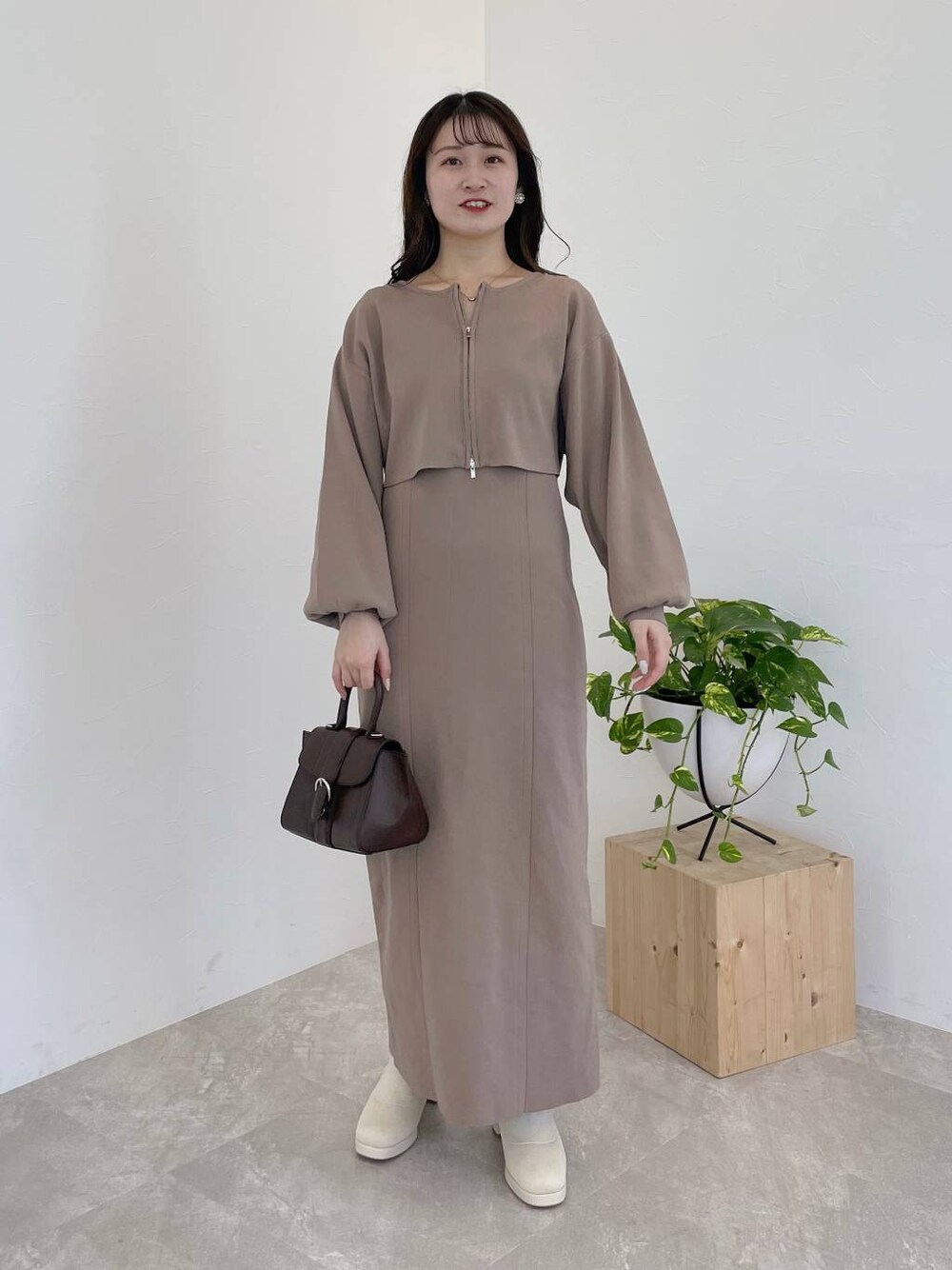 155cm|骨格ウェーブ 【ワンピース】 ショートカーデとワンピースがセットのアイテム! カーデはジッパーなので少しカジュアルな印象に☺︎ wジップなので開け方をアレンジできます♪ 【ブーツ】 厚底デザインなのでヒールの高低差は少なく疲れにくいです。ヒールも太めで安定感があります。 ※サンプルのためシューズはLサイズを着用していますが、普段は23.5cmでMサイズを履いています