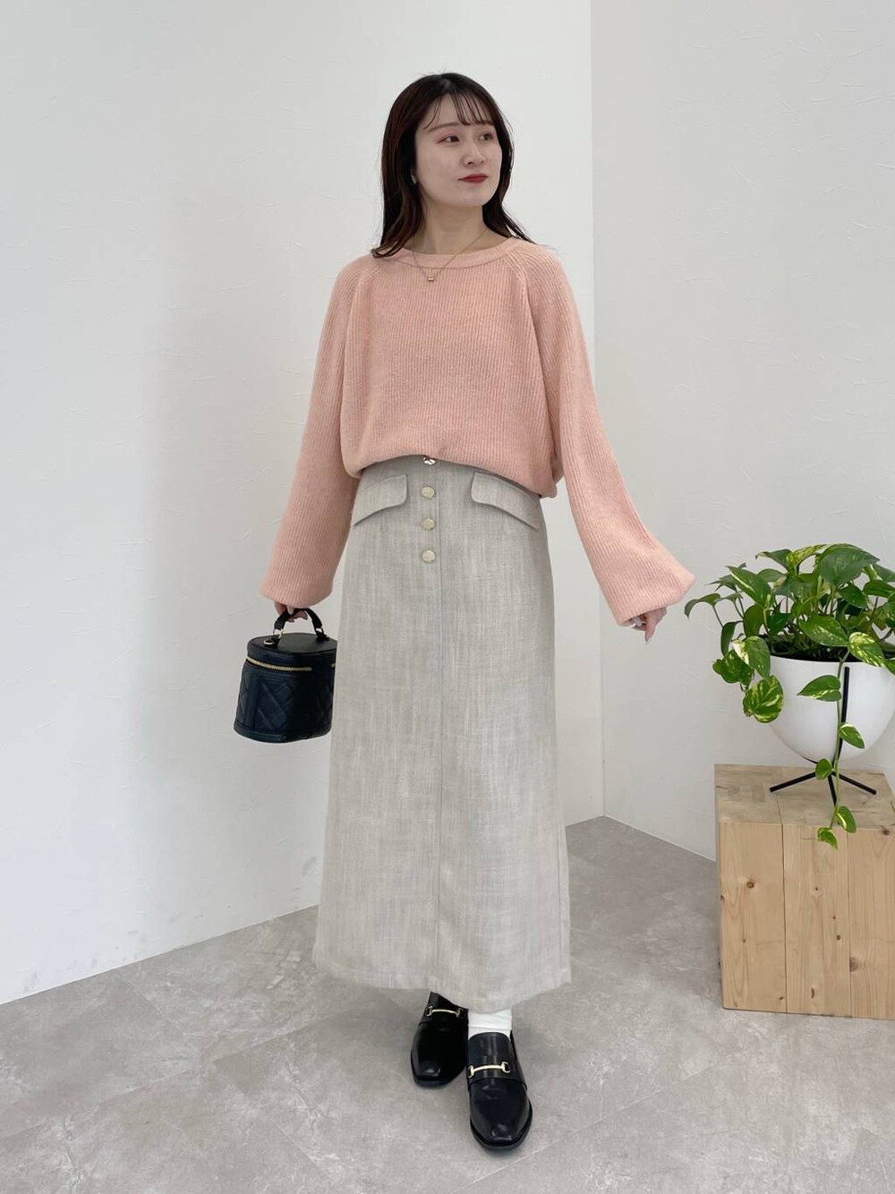 155cm|骨格ウェーブ 【ニット】 ニットのカラーをアイスクリームのフレーバーに例えた名前も可愛すぎるニット!! 柔らかい生地感でチクチクゼロです! 形はシンプルで、首元は開きすぎず詰まりすぎずなクルーネック。 お袖は少し長めでボリュームが出せます❤︎ 【スカート】 レトロなゴールドボタンのついたスカート♪ 縦のラインが綺麗に見えるタイトスカートです。 生地感は厚すぎず、裏地のない裾の方は若干の透け感があります。 インスタイルもアウトスタイルも楽しめます! 【シューズ】 オールシーズン使えてデイリー使いしやすいローファー!きれいめ見えするスクエアトゥがフェミニンコーデにぴったりです♪ ※サンプルのためシューズはLサイズを着用していますが、普段は23.5cmでMサイズを履いています