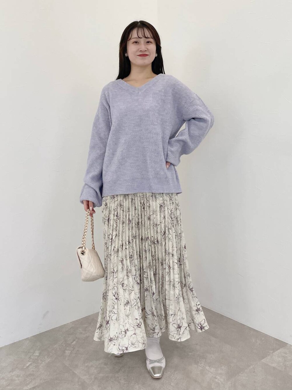 155cm|骨格ウェーブ 【ニット】 大人気のWEB限定ニット、アイスクリームニットからVネックバージョンが登場しました! 柔らかい生地感でチクチクゼロです! クルーネックバージョンと比べると着丈が長く、よりゆるっと着られます☺︎ ネックは開きすぎないVネックで骨格ウェーブの私でも安心して着られます♪ 【スカート】 通年使える生地感の花柄プリーツスカート❤︎ 裾に向かって消しプリーツになっているデザインもポイント! ウエストはゴムなので楽ちんです☺︎ 【シューズ】 透け感のあるデザインがお洒落すぎるバレエシューズ!軽くて履き心地◎フラットでも脚が綺麗に見えます♪ ※サンプルのためシューズはLサイズを着用していますが、普段は23.5cmでMサイズを履いています