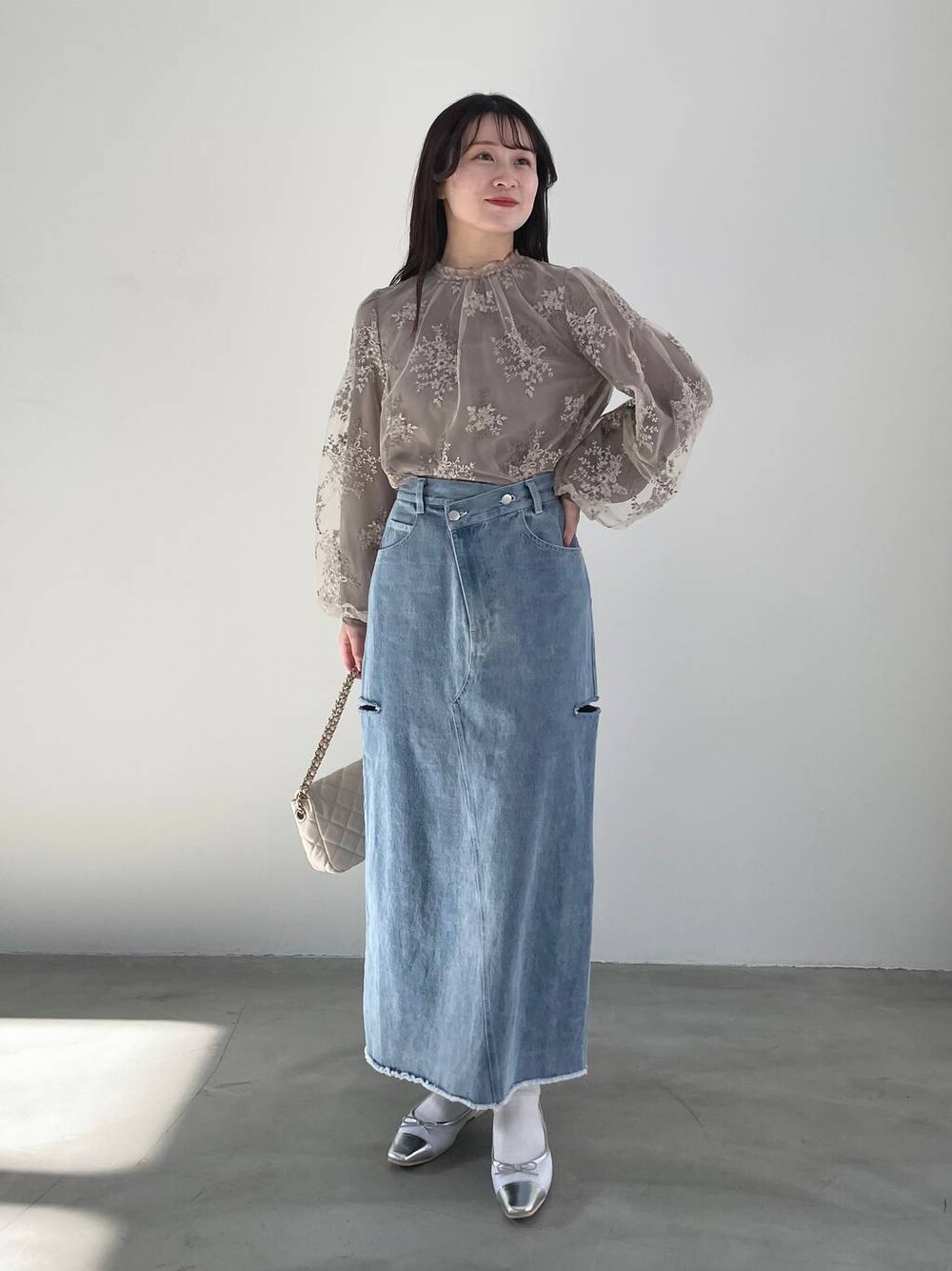 155cm|骨格ウェーブ 【ブラウス】 不動の大人気!フローラルブラウスが今年も登場しました☺︎ 繊細な刺繍デザインがコーディネートを上品に見せてくれ、かつお家でお洗濯できちゃう優秀ブラウスです。 【スカート】 さりげなく施されたサイドスリットがトレンド感◎ 空きすぎないように調整されていて、安心して着用できます! ウエストのクロスデザインもポイントになります♪ 【シューズ】 透け感のあるデザインがお洒落すぎるバレエシューズ!軽くて履き心地◎フラットでも脚が綺麗に見えます♪ ※サンプルのためシューズはLサイズを着用していますが、普段は23.5cmでMサイズを履いています