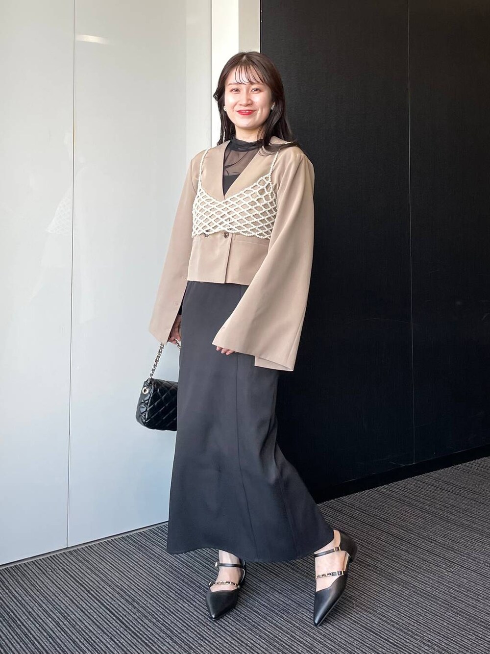 155cm|骨格ウェーブ 【ジャケット】 袖スリットにもアレンジ可能なジャケット♪ 短丈&ノーカラーでオケージョンにも合わせられます☺︎ ワンピースにゆるっと羽織ったり、綺麗めパンツと合わせた通勤コーデも楽しめます! 【ビスチェ】 トレンドのパールビスチェ! シンプルなオケージョンに合わせると一気にこなれ感でます。 【ワンピース】 シアートップスとキャミワンピのセットアイテム♪ キャミワンピにはチェーンがついており取り外しが可能!シンプルなデザインでも着用できます。 Iラインが綺麗なキャミワンピなので細見え効果も◎ ※アジャスターはついていないので調整できません 155cmでくるぶしあたりの長さです 【シューズ】 チェーン付きのローヒールパンプス☺︎ ポインテッドトゥが、コーディネートを綺麗めに見せてくれます♪普段使いはもちろん、オケージョンにもオススメです。 ※サンプルのためシューズはLサイズを着用していますが、普段は23.5cmでMサイズを履いています
