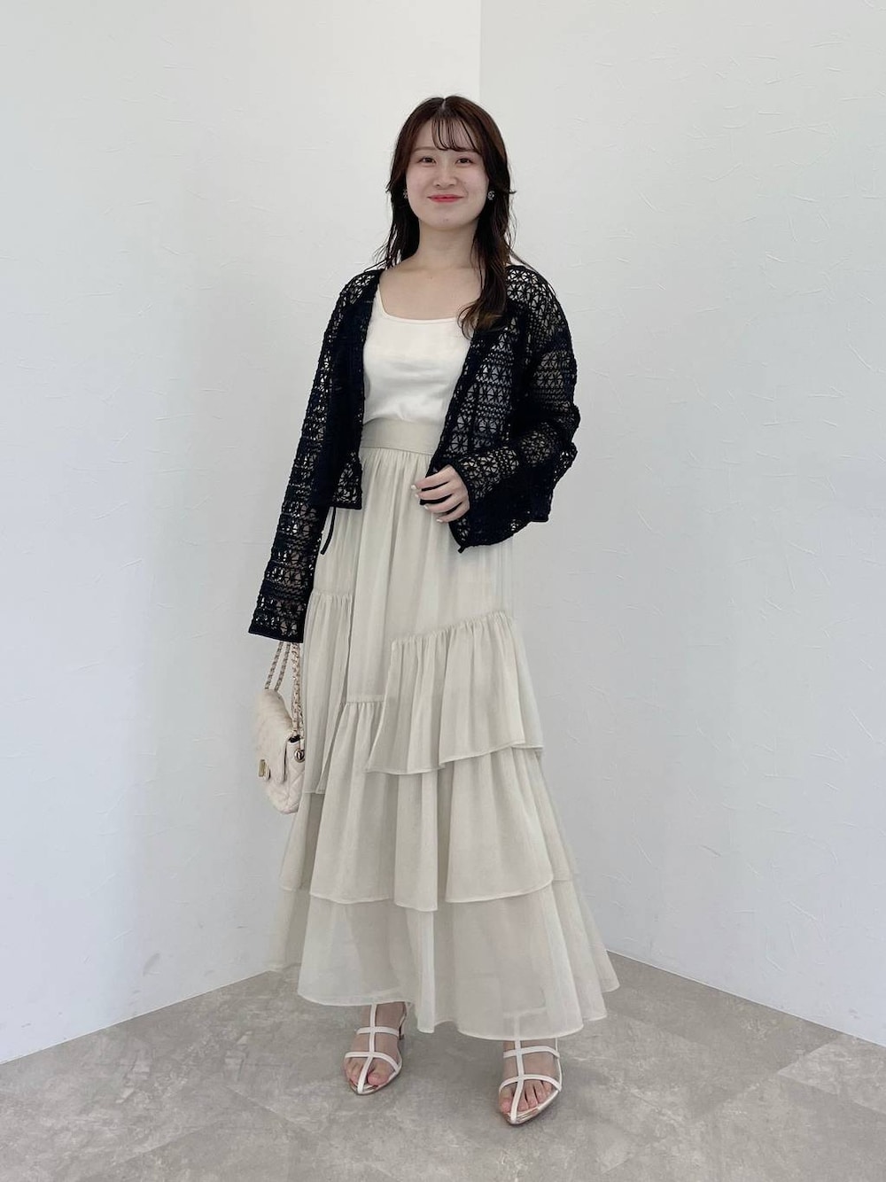 155cm|骨格ウェーブ 【トップス】 透かし編みが春夏で着たくなるデザイン!webでしかゲットできないアイテムです◎ 前後2wayで、リボン前でも後ろでも着用できます♪ 【スカート】 秋冬で大人気だったティアードスカートの春夏バージョン♪ 少し光沢感があり上品さが増しました♡ ティアードが広がりすぎずすっきり魅せてくれます。 【サンダル】 細めなストラップが華奢見えするサンダル!フェミニンコーデからカジュアルコーデにまで合わせられる万能サンダルです。 ※サンプルのためシューズはLサイズを着用していますが、普段は23.5cmでMサイズを履いています
