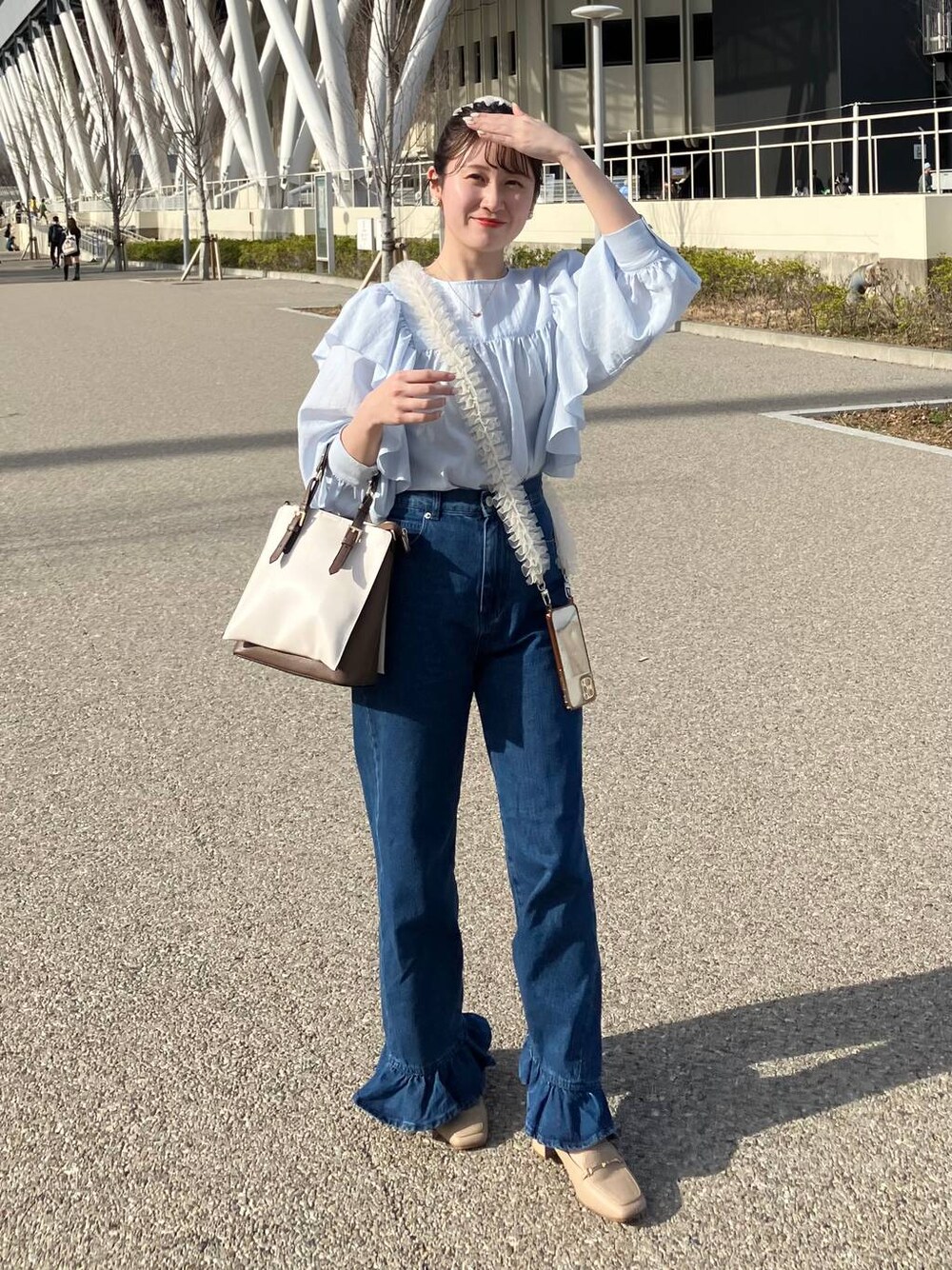 155cm|骨格ウェーブ 【ブラウス】 web限定アイテム! 春はフリルブラウス着たくなりますよね☺︎ ボリューム袖も女性らしく、オンオフ問わず着用できます! 首元がハイネックではないところもポイント! 【パンプス】 程よい高さのヒールで長時間歩く時、立っている時にも疲れにくいパンプス◎ 太めのヒールが安定感抜群です!