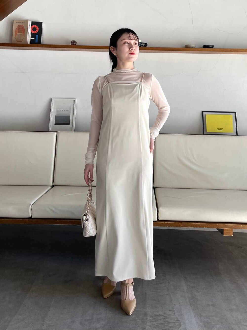 155cm|骨格ウェーブ 【ワンピース】 シアートップスとキャミワンピのセットアイテム♪ キャミワンピにはチェーンがついており取り外しが可能!シンプルなデザインでも着用できます。 Iラインが綺麗なキャミワンピなので細見え効果も◎ ※アジャスターはついていないので調整できません 155cmでくるぶしあたりの長さです 【パンプス】 ポインテッドトゥとTストラップデザインがコーディネートを上品に仕上げてくれるシューズです。 程よいヒールで脚が盛れつつも疲れにくい♪ ※サンプルのためシューズはLサイズを着用していますが、普段は23.5cmでMサイズを履いています