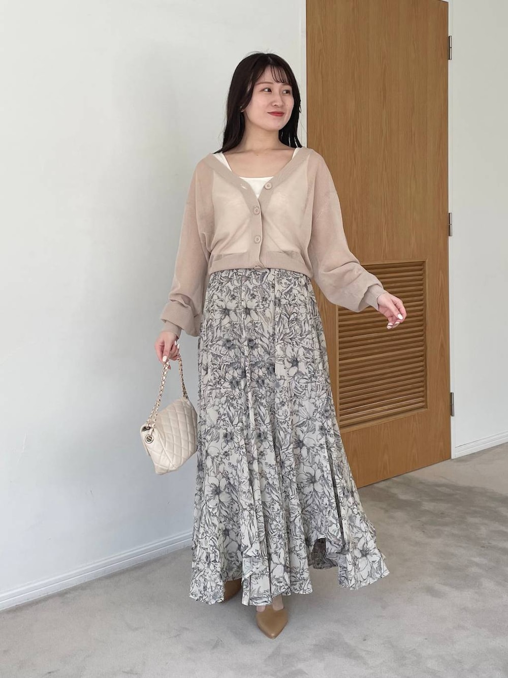 155cm|骨格ウェーブ 【トップス】 1枚あると使えるシアーカーディガン! 羽織りでも、ボタンを閉じてトップスとして着用もできます◎ 【スカート】 マーメイドスカートなのに骨盤が目立ちにくく、裾の揺れ感が可愛いと大人気です☺︎ オールシーズン使えるのもおすすめのポイントです! 【パンプス】 ポインテッドトゥとTストラップデザインがコーディネートを上品に仕上げてくれるシューズです。 程よいヒールで脚が盛れつつも疲れにくい♪ ※サンプルのためシューズはLサイズを着用していますが、普段は23.5cmでMサイズを履いています