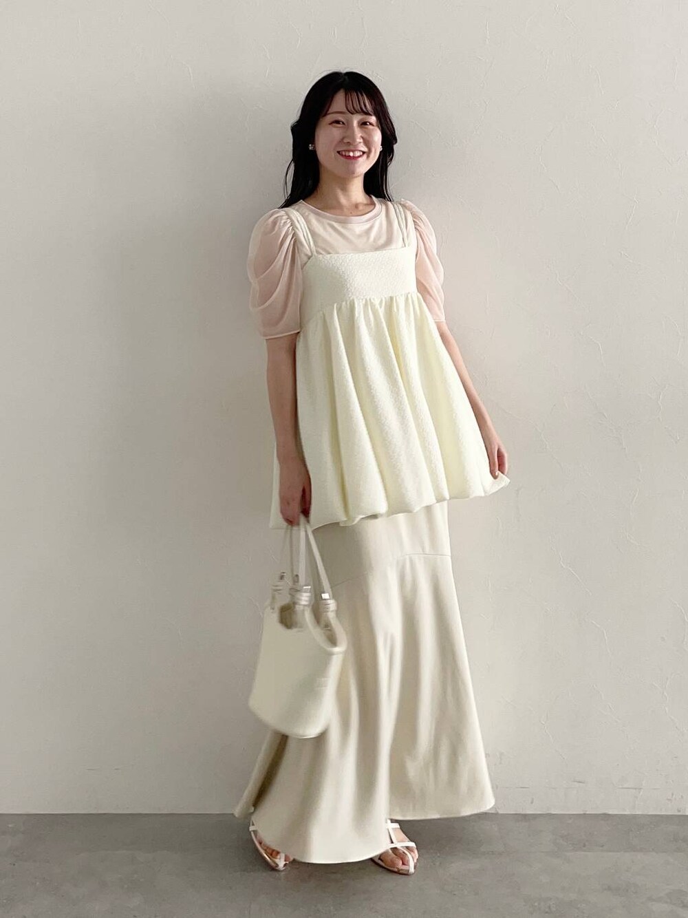 155cm|骨格ウェーブ 【トップス】 さりげないラメ感が上品! 柔らかい素材でチクチク感もなく着やすいです。 透けすぎない袖デザインが涼しさ&体型カバーばっちり♪ 【チュニック】 ポコポコとした表面感&バルーンデザインがお洒落! 真夏はチュニック1枚でも良し、Tシャツに重ねるの着こなしもお洒落です❤︎ 【スカート】 綺麗めシルエットで、すらっと見えるように着丈は長めの設定。 ハイウエストで脚長効果もバッチリです◎ バックフレア部分だけ生地を増やしてもらい、揺れ感がより上品! オールシーズン履けるのでTシャツからニットまで合わせられます♡ 【サンダル】 細めなストラップが華奢見えするサンダル!フェミニンコーデからカジュアルコーデにまで合わせられる万能サンダルです。 ※サンプルのためシューズはLサイズを着用していますが、普段は23.5cmでMサイズを履いています