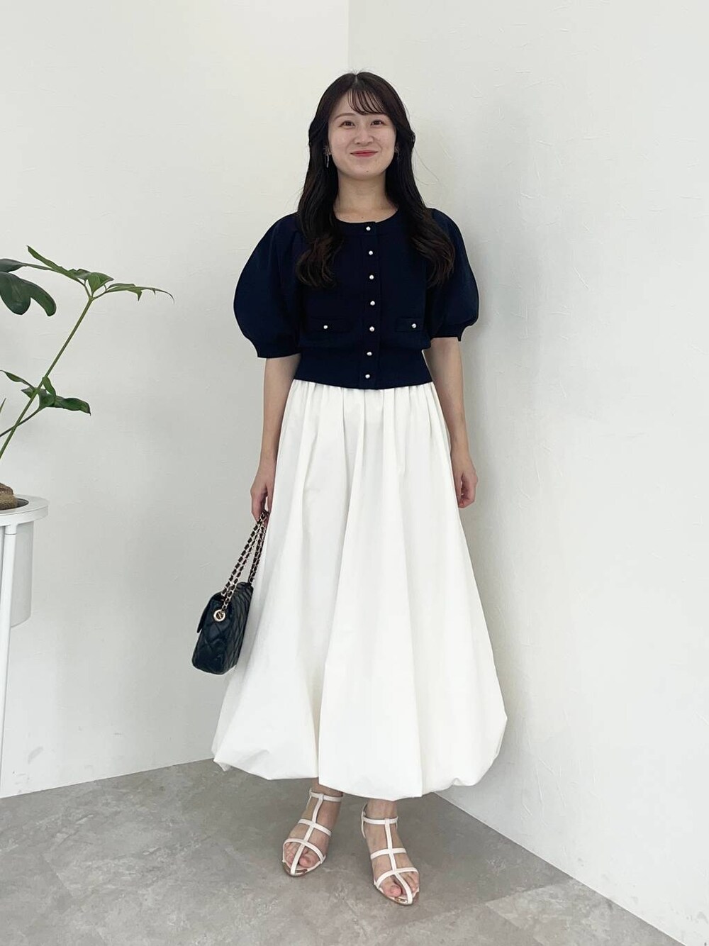 155cm|骨格ウェーブ 【トップス】 パワショルデザインが女性らしい印象にしてくれるカーディガン♪ 小さな金ボタンもさりげなくポイントに☺︎ コンパクトな丈なので出して着てもバランス良く着られます。 【スカート】 トレンドのバルーンスカート!! シンプルですが裾のバルーンデザインがぽわっとお洒落なシルエットに♡ トップスはインしたスタイリングがおすすめです☺︎ 【サンダル】 細めなストラップが華奢見えするサンダル!フェミニンコーデからカジュアルコーデにまで合わせられる万能サンダルです。リアルバイしました♡