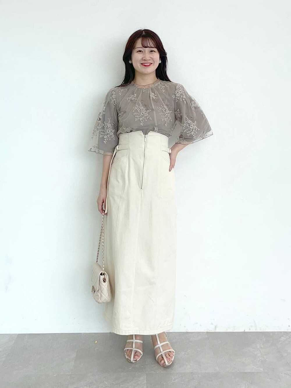 155cm|骨格ウェーブ 【ブラウス】 大好きなフローラル刺繍ブラウスの5分袖バージョン! 上品な刺繍デザインが高見えするデザインです。 これで洗濯もできちゃうなんて神すぎる!透け感あるのでインナーは必須です☺︎ 【スカート】 シンプルで着回し抜群スカート。 少しハリのある綿混素材で身体のラインを拾いすぎず縦に長く見せてくれます! サイドベルトでウエストの調整が可能です♪ 【サンダル】 細めなストラップが華奢見えするサンダル!フェミニンコーデからカジュアルコーデにまで合わせられる万能サンダルです。リアルバイしました♡
