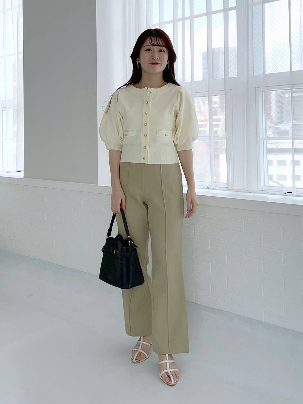 155cm|骨格ウェーブ 【トップス】 パワショルデザインが女性らしい印象にしてくれるカーディガン♪ 小さな金ボタンもさりげなくポイントに☺︎ コンパクトな丈なので出して着てもバランス良く着られます。 【パンツ】 ファスナーなしの、着脱楽ちんパンツ🤭 チュニックブラウスやシャツなどミドル丈のトップスとも相性抜群の綺麗めフレアシルエットです! 155cmで、ヒールがあった方が安心な丈感です 【サンダル】 細めなストラップが華奢見えするサンダル!フェミニンコーデからカジュアルコーデにまで合わせられる万能サンダルです。リアルバイしました♡