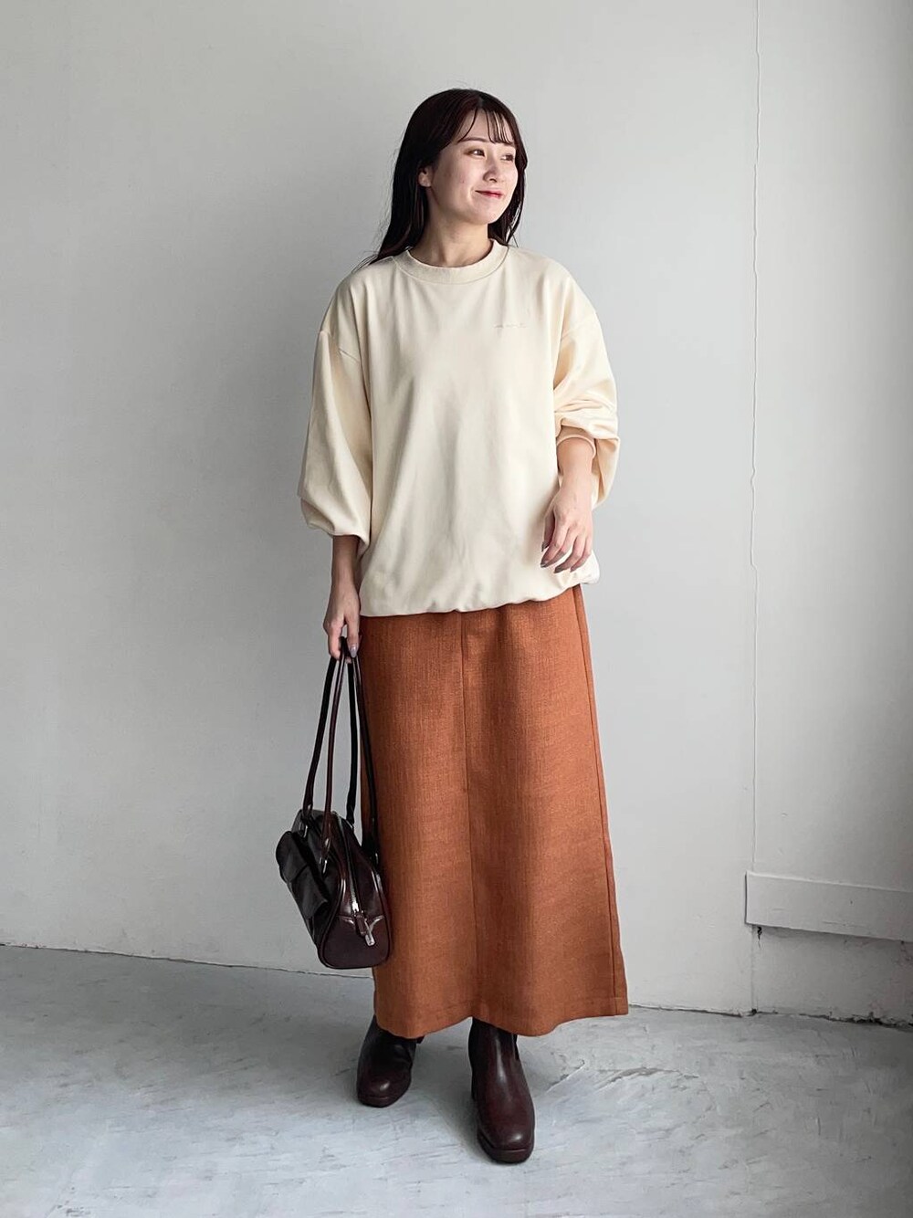 155cm|骨格ウェーブ 【スウェット】 MiO企画スウェット♪ たぽんとしたお袖にし、裾もややふんわりとしたシルエットに♡ ちび刺繍には崩した文字をさりげなく入れています☺︎ 使いやすいシンプルなデザインで、秋〜春まで使えるスウェットです♪ 【スカート】 細見えするツイードナロースカート♡ ほどよくしっかりした生地感で身体のラインを拾いにくい◎ 【ブーツ】 しっかりヒールもありますが前底にも厚みがあるので高低差がなく疲れにくいブーツ♪ ファスナーがなく、履き口がニットなので足首が痛くなりにくいです◎ ※サンプルのためシューズはLサイズを着用していますが、普段は23.5cmでMサイズを履いています