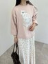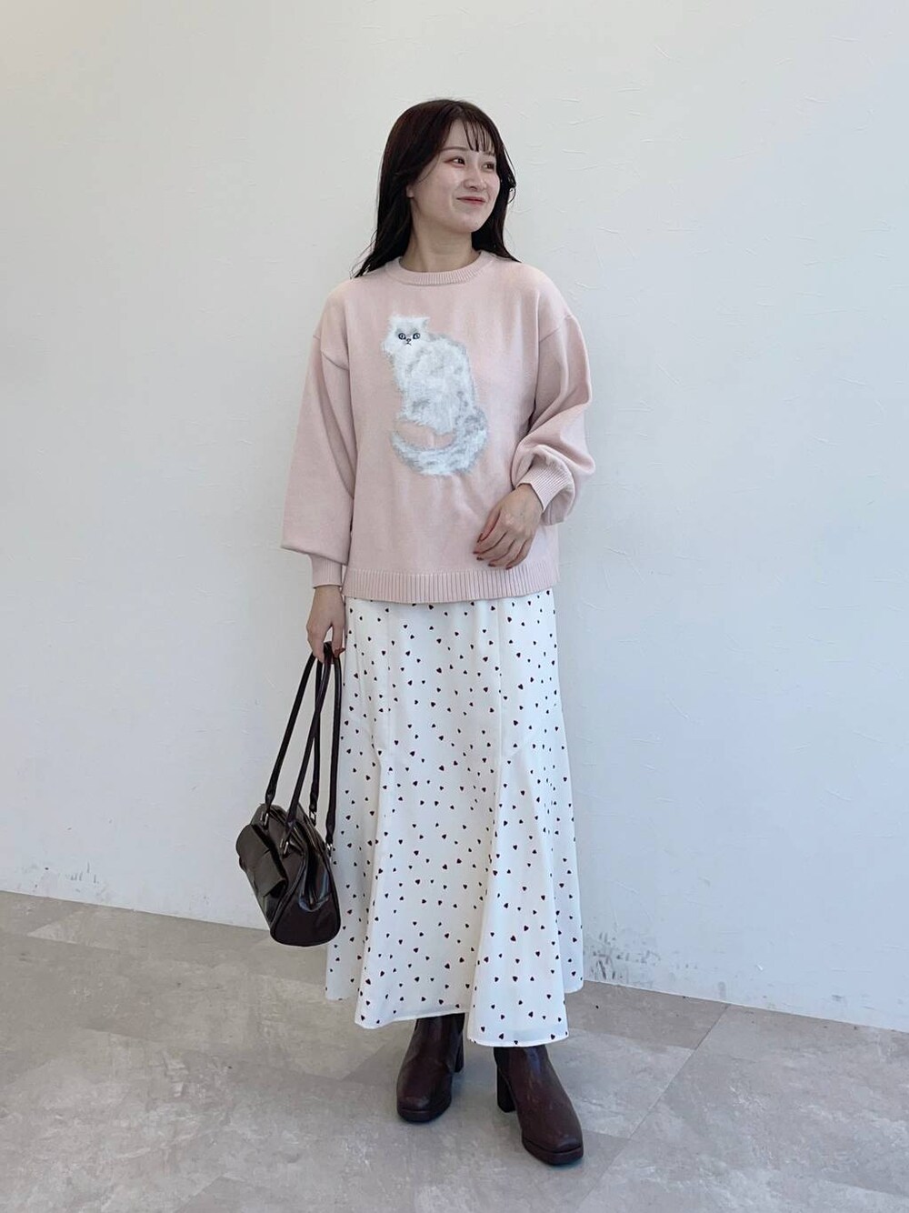 155cm|骨格ウェーブ 【ニット】 WEB限定の猫ちゃんニット!🩷 コンパクトすぎずオーバーサイズすぎない、使いやすいサイズ感♪ 柄スカートやデザインスカートと合わせて甘めに着こなすのがお気に入りです☺︎ 【スカート】 ハートが散りばめられた総柄スカート♪ シンプルなニットを合わせるだけで映えます! オールシーズン履ける生地感です☺︎ 【ブーツ】 しっかりヒールもありますが前底にも厚みがあるので高低差がなく疲れにくいブーツ♪ ファスナーがなく、履き口がニットなので足首が痛くなりにくいです◎ ※サンプルのためシューズはLサイズを着用していますが、普段は23.5cmでMサイズを履いています
