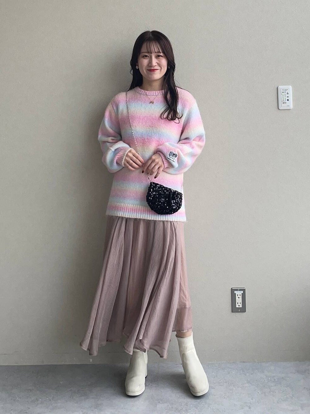 155cm|骨格ウェーブ 【ニット】 キキ&ララとmysty womanがコラボ♪ わたあめのようなグラデーションニット♡ 配色に入っているカラーやデニムと合わせるのがおすすめです🤭✨ 【スカート】 MiO企画のシアースカート♡ 箔プリントデザインで上品な光沢が高見えするスカートです♪ フレアシルエットですが広がりすぎず、裏地が少し短めなのですっきりした印象で履いていただけます◎ オールシーズン着用できますが、秋冬の重ためニットとの合わせが相性抜群です! 【ブーツ】 しっかりヒールもありますが前底にも厚みがあるので高低差がなく疲れにくいブーツ♪ ファスナーがなく、履き口がニットなので足首が痛くなりにくいです◎ ※サンプルのためシューズはLサイズを着用していますが、普段は23.5cmでMサイズを履いています
