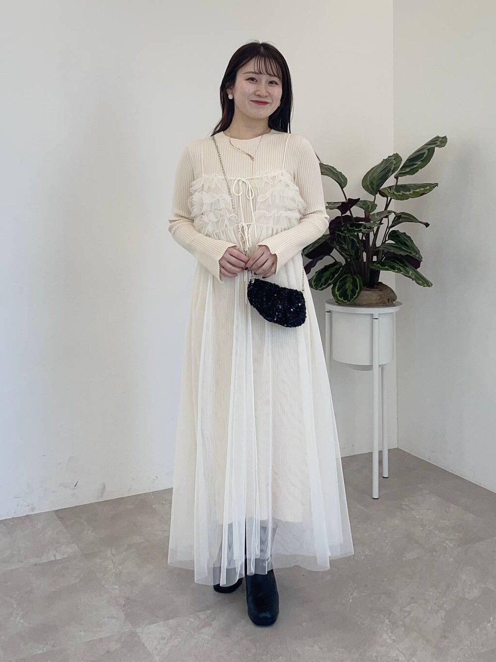 155cm|骨格ウェーブ 【ワンピース】 ニットワンピースとチュールキャミワンピースのセットアイテム♪ 1着でお洒落なレイヤードスタイルが完成します! チュールキャミワンピースは前後2wayです。 【ブーツ】 しっかりヒールもありますが前底にも厚みがあるので高低差がなく疲れにくいブーツ♪ ファスナーがなく、履き口がニットなので足首が痛くなりにくいです◎ ※サンプルのためシューズはLサイズを着用していますが、普段は23.5cmでMサイズを履いています