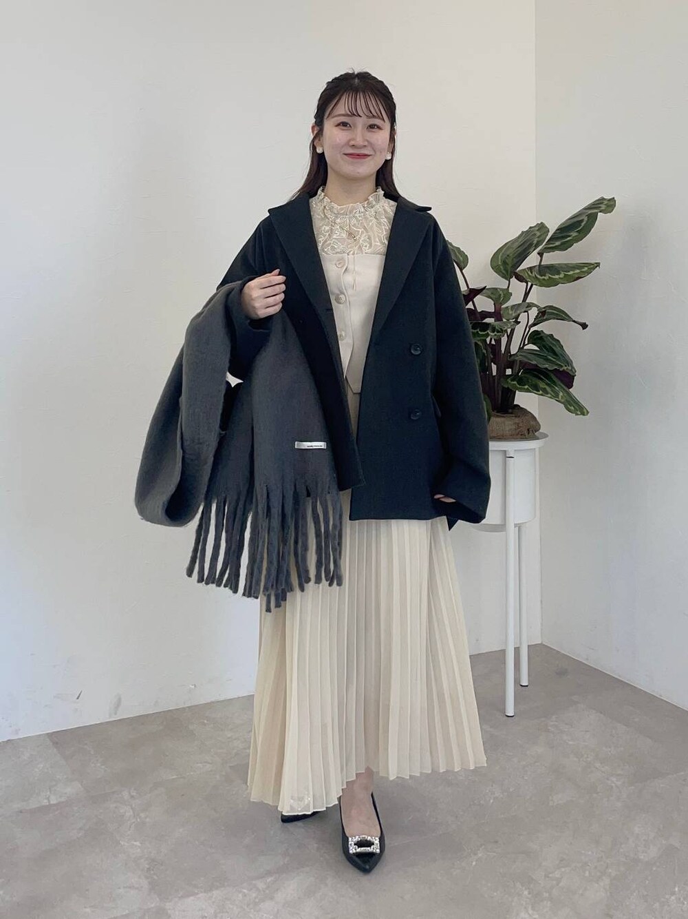 155cm|骨格ウェーブ 【アウター】 ゆるっと感が可愛いオーバーサイズのジャコット♡ ジャケットの綺麗さもありますが、カジュアルコーデにも合わせやすいアウターです♪ 【ブラウス】 フレアスリーブが可愛い刺繍ブラウス☺︎ 高級感のある上品なデザインで、お呼ばれシーンでも活躍してくれます♪ 【スカート】 コルセットとプリーツスカートがセットアイテム♪ ファスナーがなくウエストが総ゴムなので着脱が楽ちん&履き心地抜群! 【パンプス】 ポインテッドトゥデザインが脚を綺麗に見せてくれるパンプス♪お呼ばれシーンにもおすすめです。 ※サンプルのためシューズはLサイズを着用していますが、普段は23.5cmでMサイズを履いています