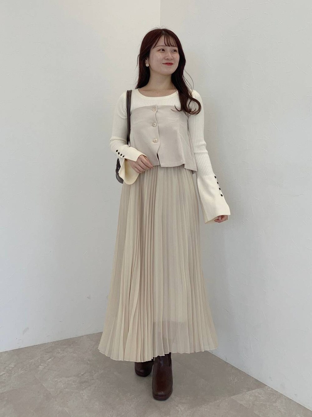 155cm|骨格ウェーブ 【ニット】 フレア袖がポイントのニットプルオーバー☺︎ 袖のボタンもポイントです♪ ニット自体フィット感はありますが、首元がすっきりしているので細見え効果が…!! 【スカート】 コルセットとプリーツスカートがセットアイテム♪ ファスナーがなくウエストが総ゴムなので着脱が楽ちん&履き心地抜群! 【ブーツ】 しっかりヒールもありますが前底にも厚みがあるので高低差がなく疲れにくいブーツ♪ ファスナーがなく、履き口がニットなので足首が痛くなりにくいです◎ ※サンプルのためシューズはLサイズを着用していますが、普段は23.5cmでMサイズを履いています