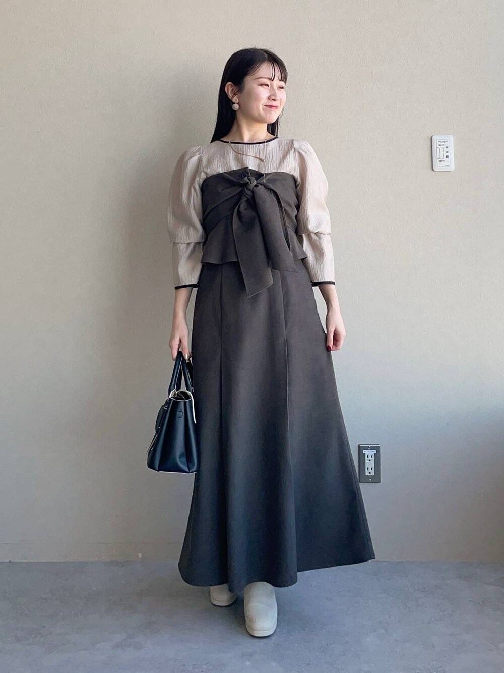 155cm|骨格ウェーブ 【トップス】 バイカラーなデザインが可愛すぎるブラウス! キャンディースリーブなのもどツボなデザイン♪ しぼ感のある素材なのでデニム合わせなどカジュアルなスタイリングにもバッチリ合います◎ 【スカート】 コルセットとセットのスカートから秋冬素材バージョン登場です♪ 腰回りはすっきり、上品に着こなせるフレアシルエットです。 コルセットはビスチェでも着用でき、リボンデザインがコーデのポイントに! 【ブーツ】 しっかりヒールもありますが前底にも厚みがあるので高低差がなく疲れにくいブーツ♪ ファスナーがなく、履き口がニットなので足首が痛くなりにくいです◎ ※サンプルのためシューズはLサイズを着用していますが、普段は23.5cmでMサイズを履いています