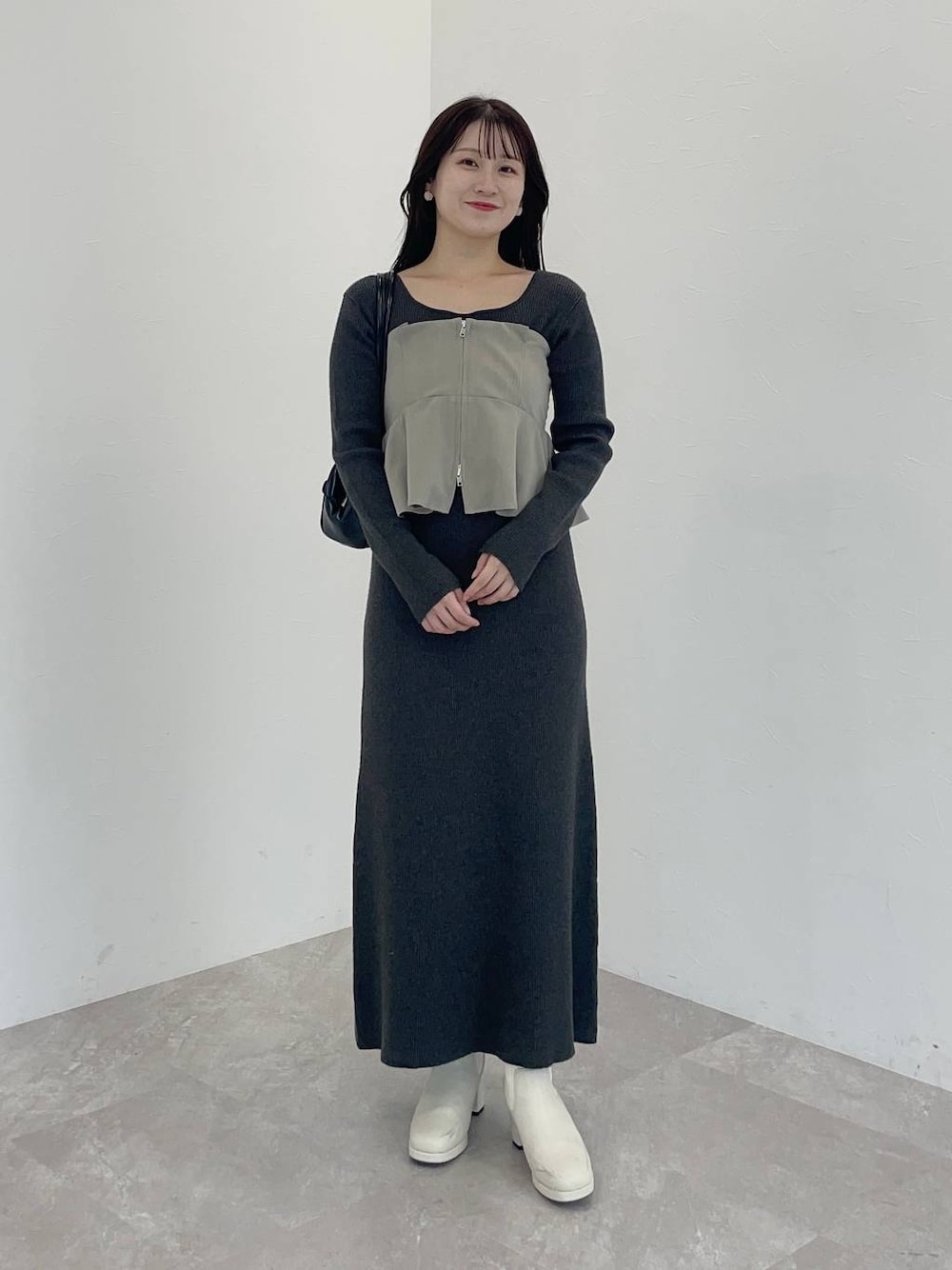 155cm|骨格ウェーブ 【ワンピース】 フェザーキャミとニットワンピースのセットアイテム! ワンピースの着回しです。 ニットワンピは柔らかい生地感でストレスフリーな着心地♪ 【コルセット】 大人気のコルセットシリーズからパンツバージョン登場♡ コルセットの着回しです♪ フロントzipで着脱楽ちんです☺︎ 【ブーツ】 しっかりヒールもありますが前底にも厚みがあるので高低差がなく疲れにくいブーツ♪ ファスナーがなく、履き口がニットなので足首が痛くなりにくいです◎ ※サンプルのためシューズはLサイズを着用していますが、普段は23.5cmでMサイズを履いています