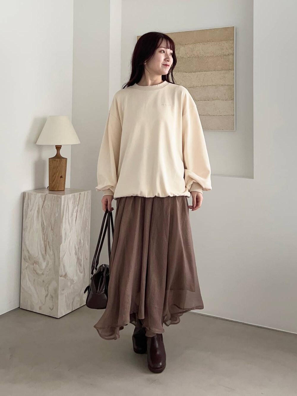 155cm|骨格ウェーブ 【スウェット】 MiO企画スウェット♪ たぽんとしたお袖にし、裾もややふんわりとしたシルエットに♡ ちび刺繍には崩した文字をさりげなく入れています☺︎ 使いやすいシンプルなデザインで、秋〜春まで使えるスウェットです♪ 【スカート】 MiO企画のシアースカート♡ 箔プリントデザインで上品な光沢が高見えするスカートです♪ フレアシルエットですが広がりすぎず、裏地が少し短めなのですっきりした印象で履いていただけます◎ オールシーズン着用できますが、秋冬の重ためニットとの合わせが相性抜群です! 【ブーツ】 しっかりヒールもありますが前底にも厚みがあるので高低差がなく疲れにくいブーツ♪ ファスナーがなく、履き口がニットなので足首が痛くなりにくいです◎ ※サンプルのためシューズはLサイズを着用していますが、普段は23.5cmでMサイズを履いています