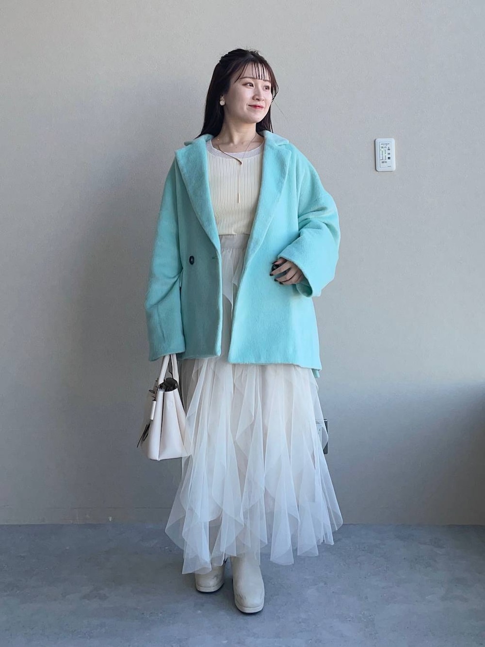 155cm|骨格ウェーブ 【アウター】 柔らかい素材で羽織り心地のよいシャギージャコット♪ 程よくオーバーサイズなので厚手のニットも着込みやすい◎ 【ニット】 袖口や首元がバイカラーになったシンプルお洒落トップス☺︎ ジャンスカのインナーにもおすすめ! 【スカート】 チュールが何枚も重なったフレアスカート! ドツボデザイン🤭💕 ファスナーはなく、ウエストはゴムなので着脱楽ちんです◎ 【ブーツ】 しっかりヒールもありますが前底にも厚みがあるので高低差がなく疲れにくいブーツ♪ ファスナーがなく、履き口がニットなので足首が痛くなりにくいです◎ ※サンプルのためシューズはLサイズを着用していますが、普段は23.5cmでMサイズを履いています