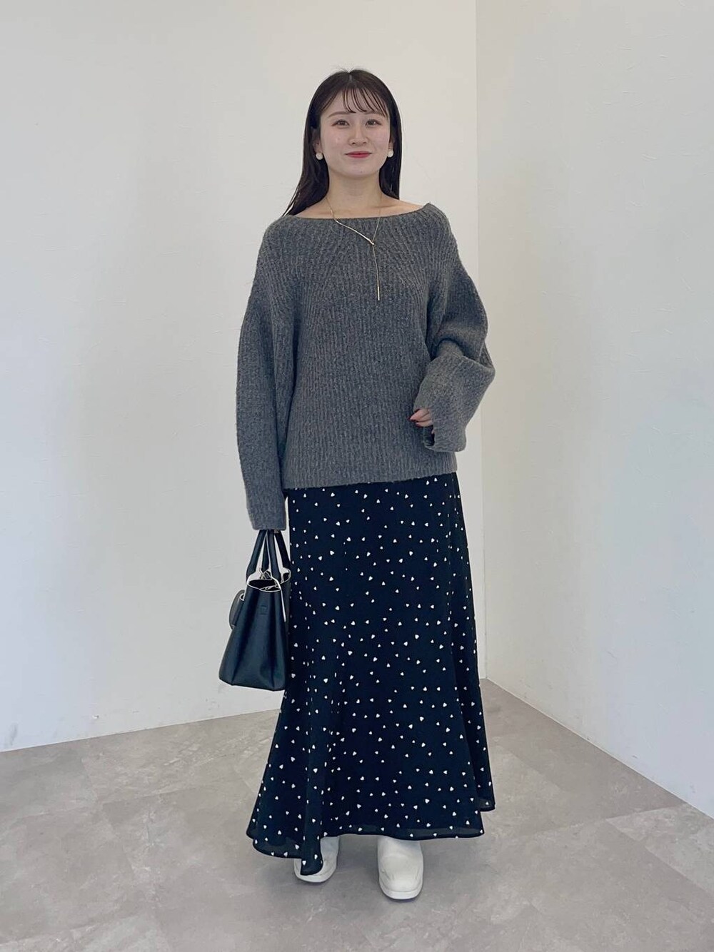155cm|骨格ウェーブ 【ニット】 首回りが詰まりすぎておらずワンショルでも着用できるニット♪ ゆるくアウトで着るのがおすすめです◎ フレアスカートや裾にデザインのあるスカートと合わせても可愛いです♡ 【スカート】 ハートが散りばめられた総柄スカート♪ シンプルなニットを合わせるだけで映えます! オールシーズン履ける生地感です☺︎ 【ブーツ】 しっかりヒールもありますが前底にも厚みがあるので高低差がなく疲れにくいブーツ♪ ファスナーがなく、履き口がニットなので足首が痛くなりにくいです◎ ※サンプルのためシューズはLサイズを着用していますが、普段は23.5cmでMサイズを履いています