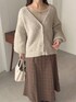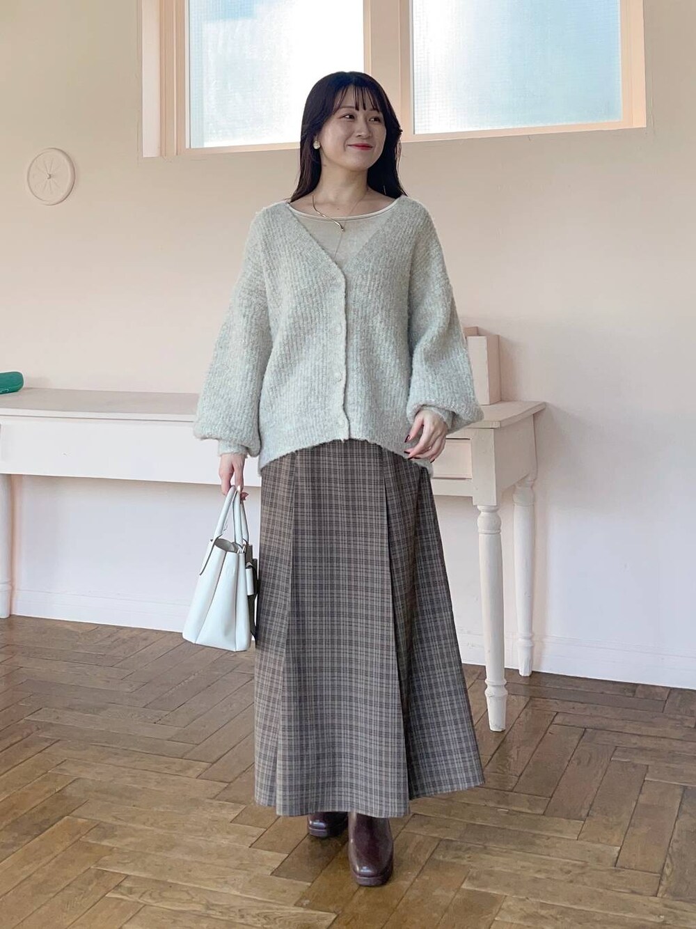 155cm|骨格ウェーブ 【カーディガン】 ゆるっとミドル丈ですが、すっきりVネックのメランジカーディガン♪ 袖のたっぷり感もとっても好み! 少し後ろに抜いて着るとこなれ感が出ます◎ 【トップス】 光沢感のある、上品なベロア素材トップス♪ ジャンスカやキャミワンピのインナーにはもちろん、カーディガンのインナーとして使うのもオシャレです☺︎ 【スカート】 コルセットとセットになったスカート♪ スカートの着回しです。 腰回りはすっきり、上品に着こなせるフレアシルエットです。 【ブーツ】 しっかりヒールもありますが前底にも厚みがあるので高低差がなく疲れにくいブーツ♪ ファスナーがなく、履き口がニットなので足首が痛くなりにくいです◎ ※サンプルのためシューズはLサイズを着用していますが、普段は23.5cmでMサイズを履いています