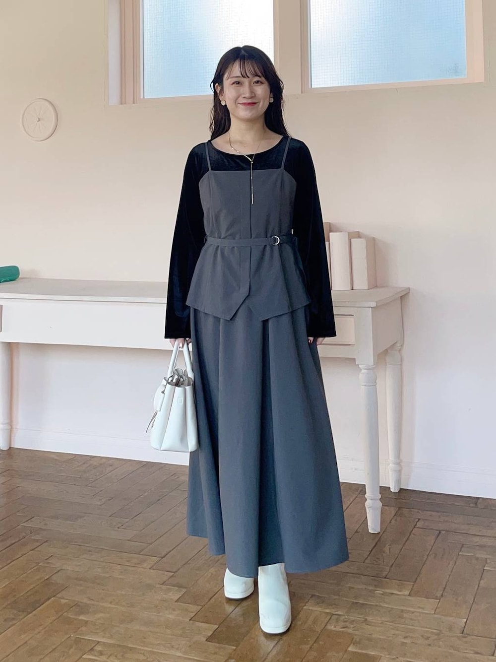 155cm|骨格ウェーブ 【トップス】 光沢感のある、上品なベロア素材トップス♪ ジャンスカやキャミワンピのインナーにはもちろん、カーディガンのインナーとして使うのもオシャレです☺︎ 【キャミワンピ】 セットアップ風なお洒落キャミワンピ! ウエストにはベルトがついていて脚長効果もばっちりです。 インナー次第で長く着回せるアイテムです◎ 【ブーツ】 しっかりヒールもありますが前底にも厚みがあるので高低差がなく疲れにくいブーツ♪ ファスナーがなく、履き口がニットなので足首が痛くなりにくいです◎ ※サンプルのためシューズはLサイズを着用していますが、普段は23.5cmでMサイズを履いています