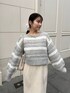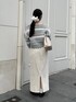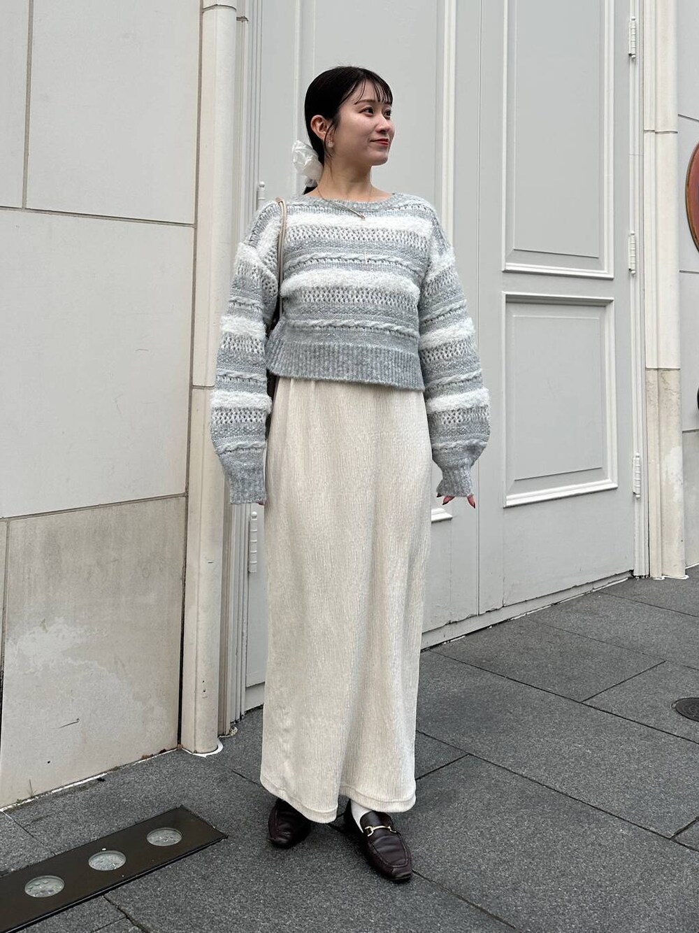 155cm|骨格ウェーブ 【ニット】 柔らかい配色のカジュアルボーダーニット♪ 色んな素材の糸が混ざっていて、ラメ入りの糸やふわふわとした糸など立体感のあるデザイン♡ 【スカート】 ベロア素材で伸縮性のあるナロースカート☺︎ 秋冬っぽい素材なので履くだけで季節感が出ます♪ ファスナーはなくウエスト総ゴムなので着脱も楽ちんです。