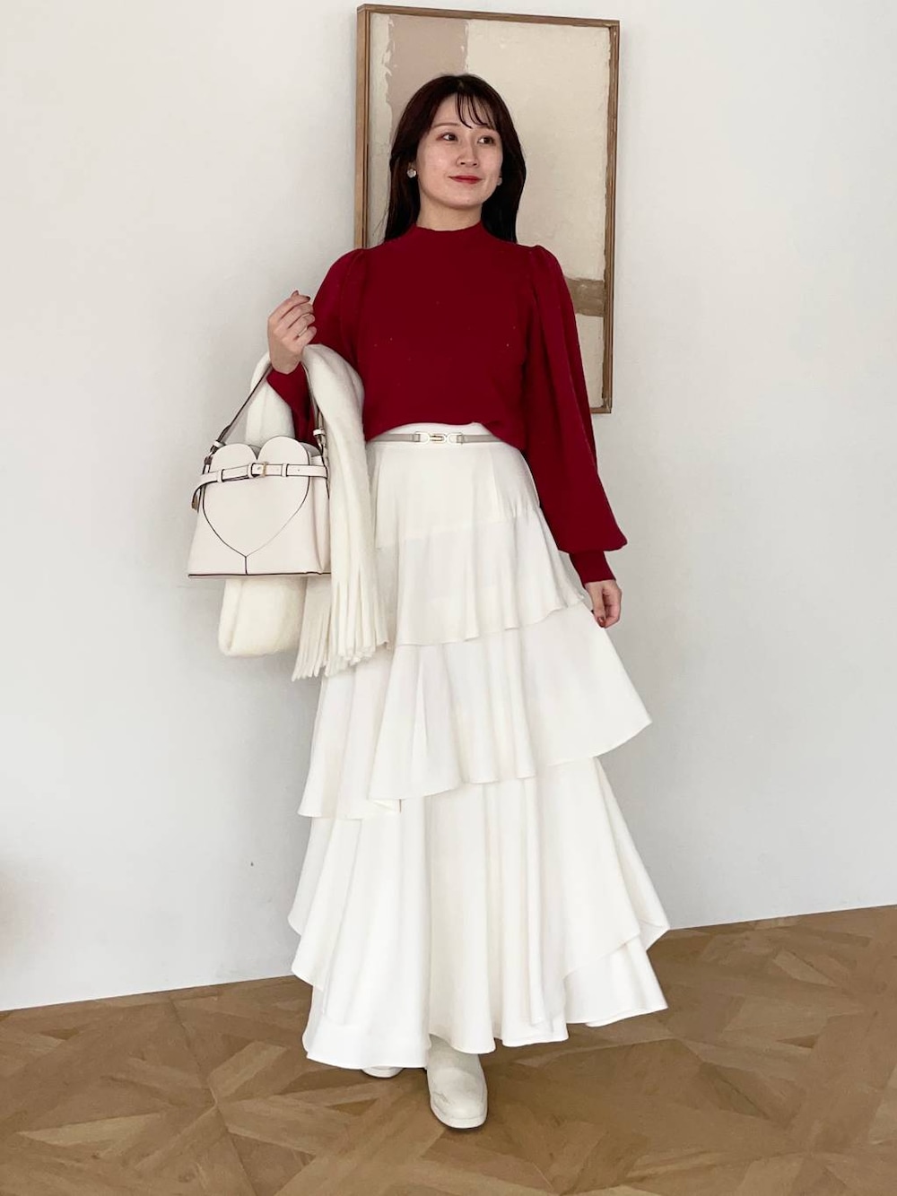 155cm|骨格ウェーブ 【ニット】 大人気のラメニット!今年もカラーが豊富です♪ ラメ入りなのにチクチクせず、程よいラメ感もフェミニンな印象に。 袖口は捲るとたぷっと可愛いボリューム袖になります☺︎ 【スカート】 ふりふりティアードの揺れ感が可愛いスカート♪ ボリュームが出過ぎないように腰回りはすっきりデザインです☺︎ 【ブーツ】 しっかりヒールもありますが前底にも厚みがあるので高低差がなく疲れにくいブーツ♪ ファスナーがなく、履き口がニットなので足首が痛くなりにくいです◎ ※サンプルのためシューズはLサイズを着用していますが、普段は23.5cmでMサイズを履いています