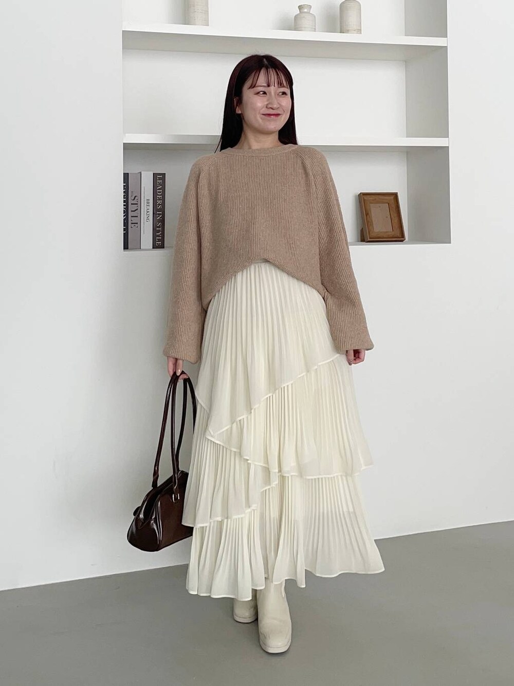 155cm|骨格ウェーブ 【ニット】 ニットのカラーをアイスクリームのフレーバーに例えた名前も可愛すぎるニット!! 柔らかい生地感でチクチクゼロです! 形はシンプルで、首元は開きすぎず詰まりすぎずなクルーネック。 お袖は少し長めでボリュームが出せます❤︎ 【スカート】 ランダムなティアードと細かいプリーツがフェミニンなスカート。 腰周りはスッキリなのでオーバーサイズのトップスも合わせやすいです♪ 【ブーツ】 しっかりヒールもありますが前底にも厚みがあるので高低差がなく疲れにくいブーツ♪ ファスナーがなく、履き口がニットなので足首が痛くなりにくいです◎ ※サンプルのためシューズはLサイズを着用していますが、普段は23.5cmでMサイズを履いています