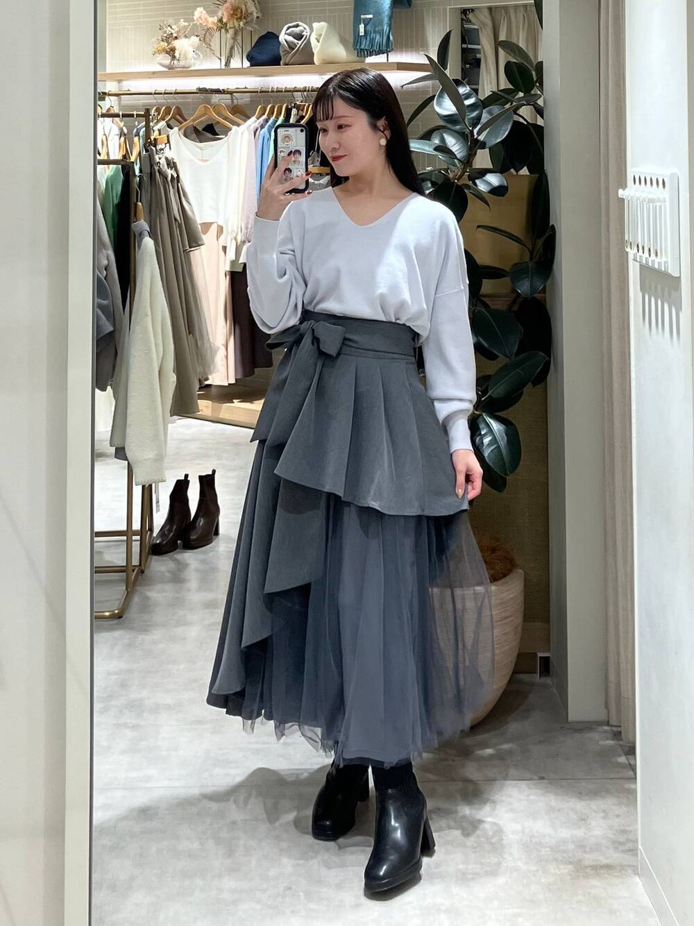 155cm|骨格ウェーブ 【ニット】 スッキリと開いたVネックが細見え効果のあるニット。 さりげないラメ入り生地も高見えします♪ 【スカート】 アシンメトリーなデザインで、ボリュームたっぷりなチュールが華やかなスカート。 ウエストのリボンは取り外し可能♪お手持ちのベルトを合わせても◎ 【ブーツ】 しっかりヒールもありますが前底にも厚みがあるので高低差がなく疲れにくいブーツ♪ ファスナーがなく、履き口がニットなので足首が痛くなりにくいです◎
