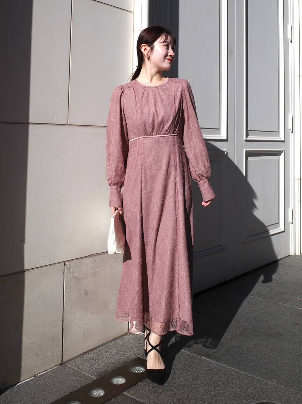 155cm|骨格ウェーブ 【ワンピース】 パイピングでポイントが入ったオケージョンワンピース♪ 上品な総レースがお呼ばれにもぴったりです。 155cmでくるぶしあたりです。