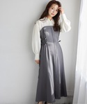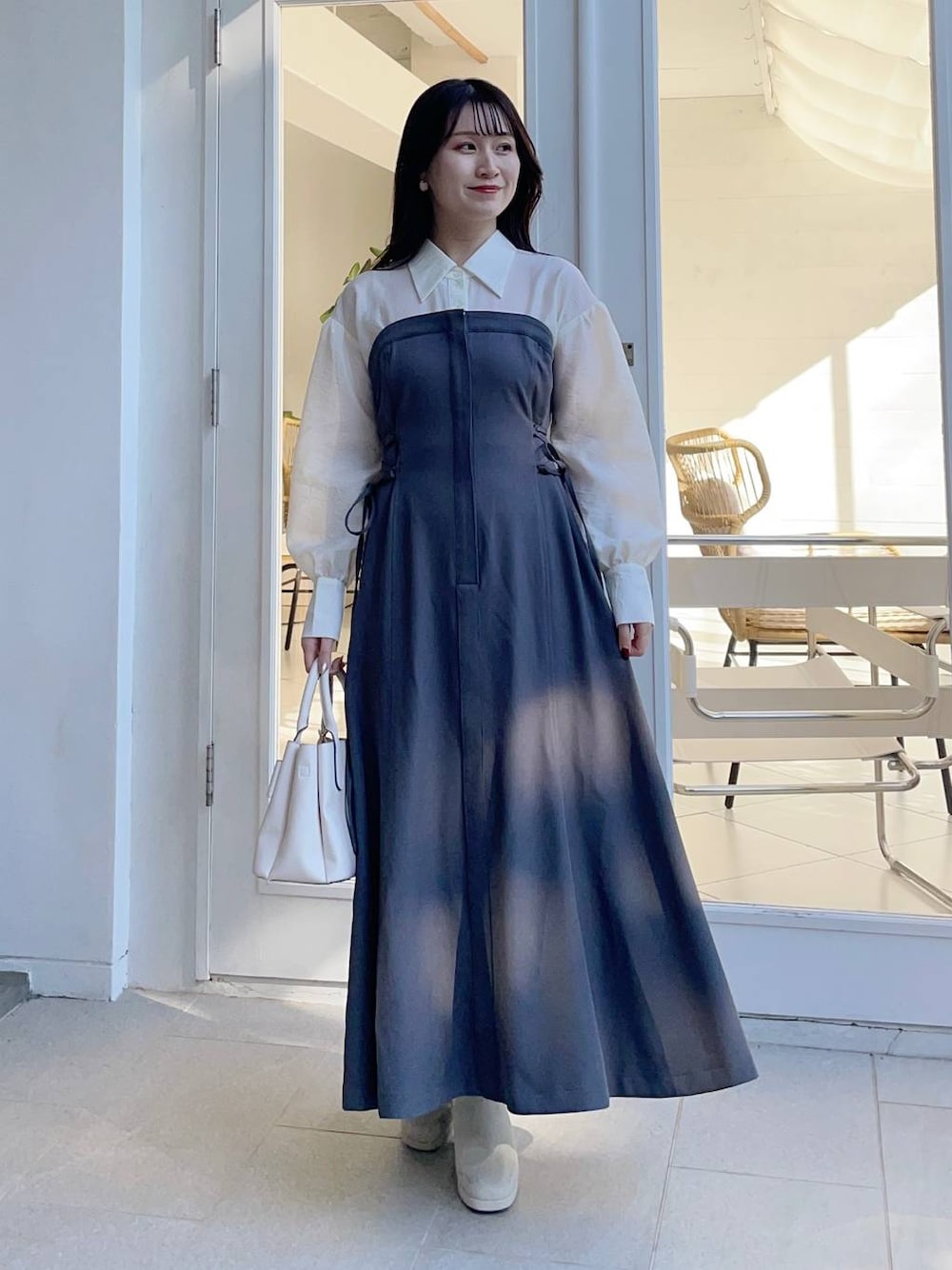 155cm|骨格ウェーブ 【ワンピース】 去年大人気だったドッキングワンピースが帰ってきた🩷 今年はサイドがレースアップになっていてウエストの調整ができます。 シャツ部分の透け感もあまりなくインナーに困らないのも嬉しい! 1枚でお洒落に決まるワンピースです♪ 【ブーツ】 しっかりヒールもありますが前底にも厚みがあるので高低差がなく疲れにくいブーツ♪ ファスナーがなく、履き口がニットなので足首が痛くなりにくいです◎ ※サンプルのためシューズはLサイズを着用していますが、普段は23.5cmでMサイズを履いています